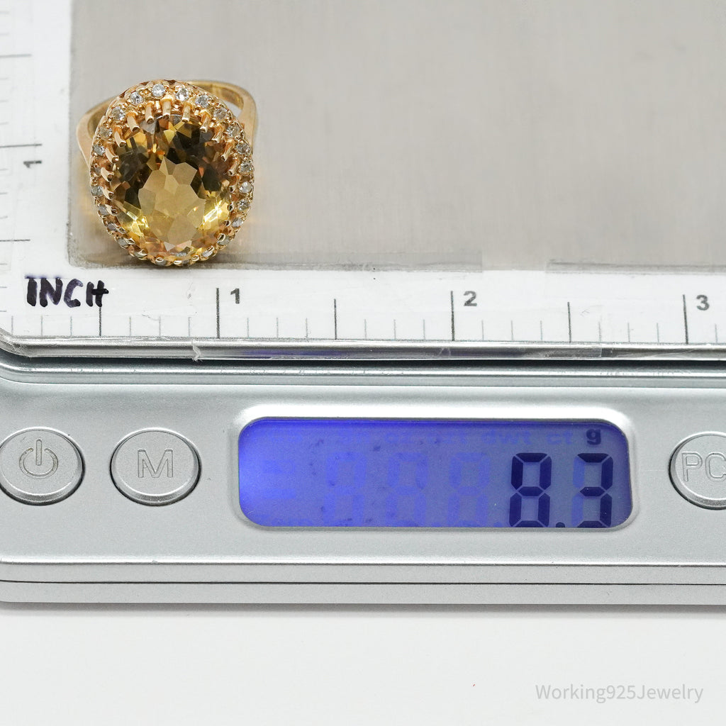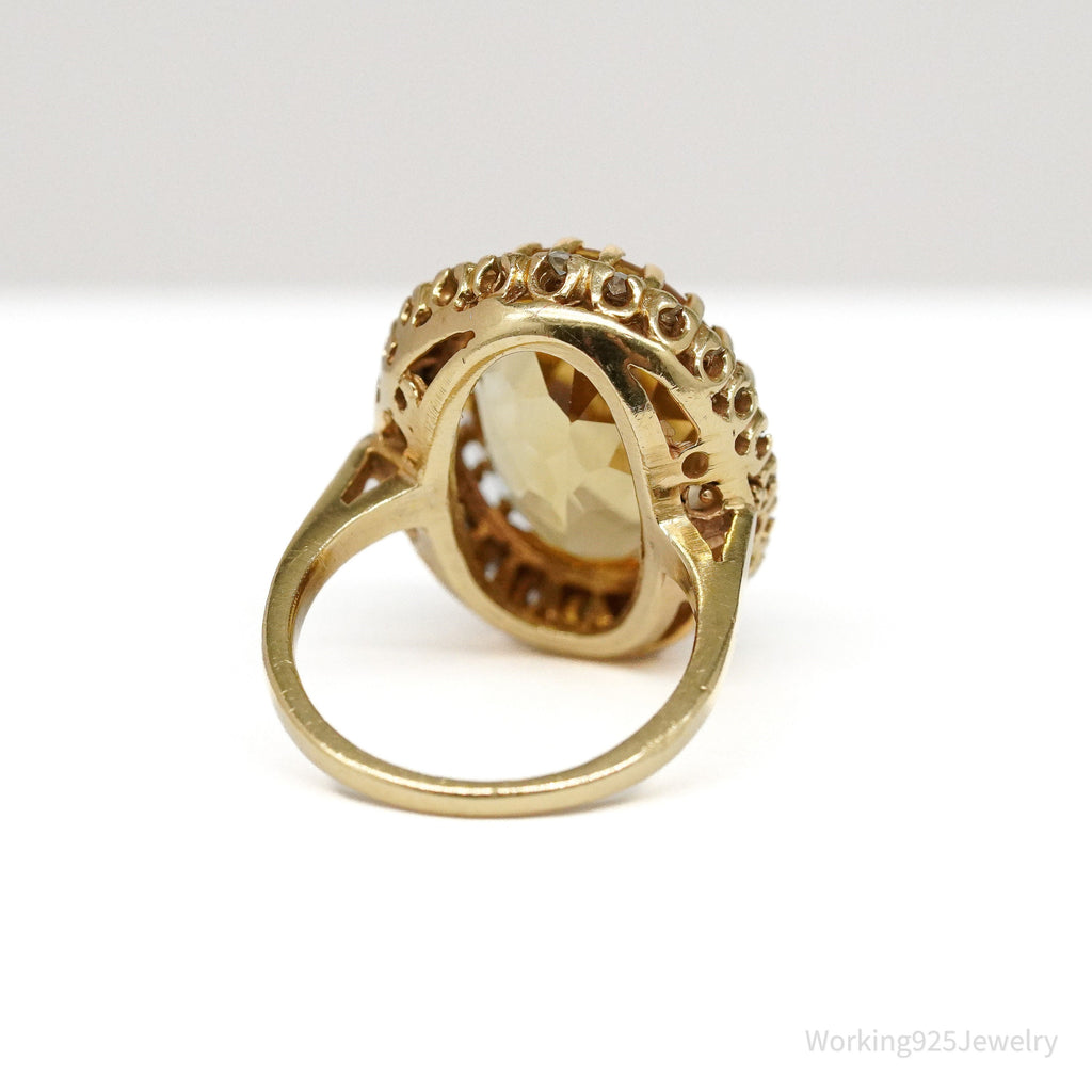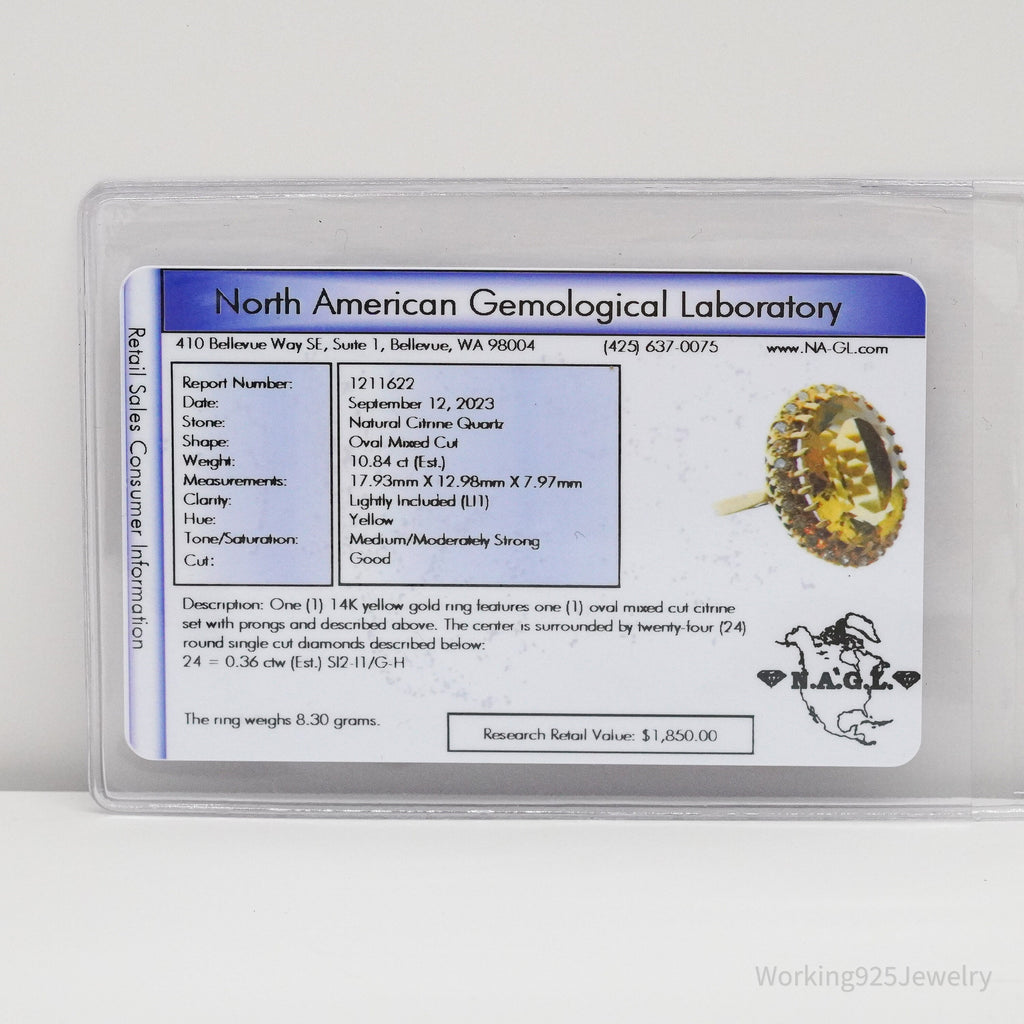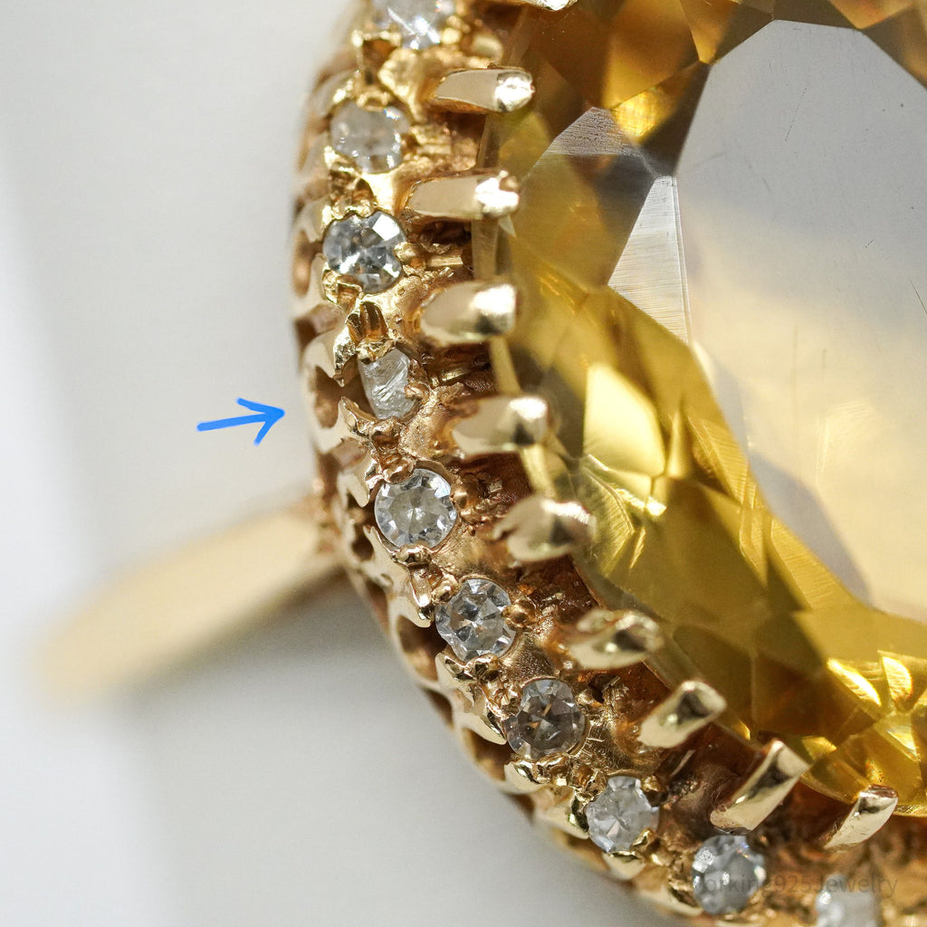 One (1) 14K yellow gold ring features one (1) oval mix-cut citrine set with prongs as described above. The center is surrounded by twenty-four (24) round single-cut diamonds described below: