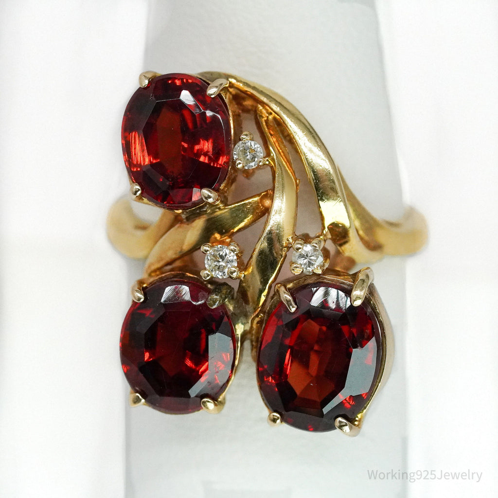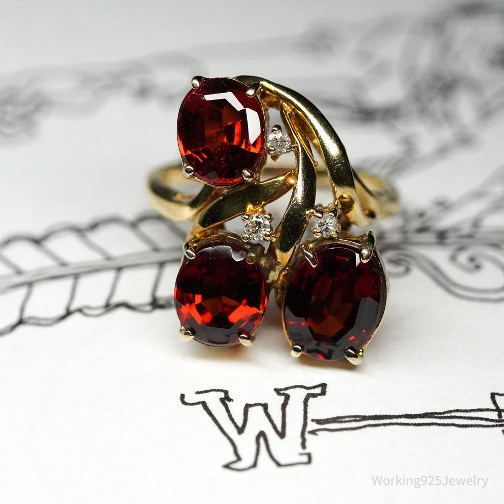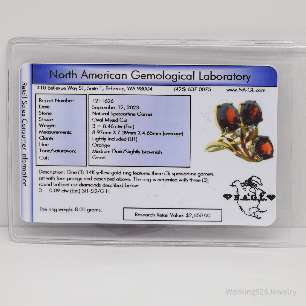 One (1) 14K yellow gold ring features three (3) spessartine garnets set with four prongs and described above. The ring is accented with three (3) round brilliant cut diamonds described below: