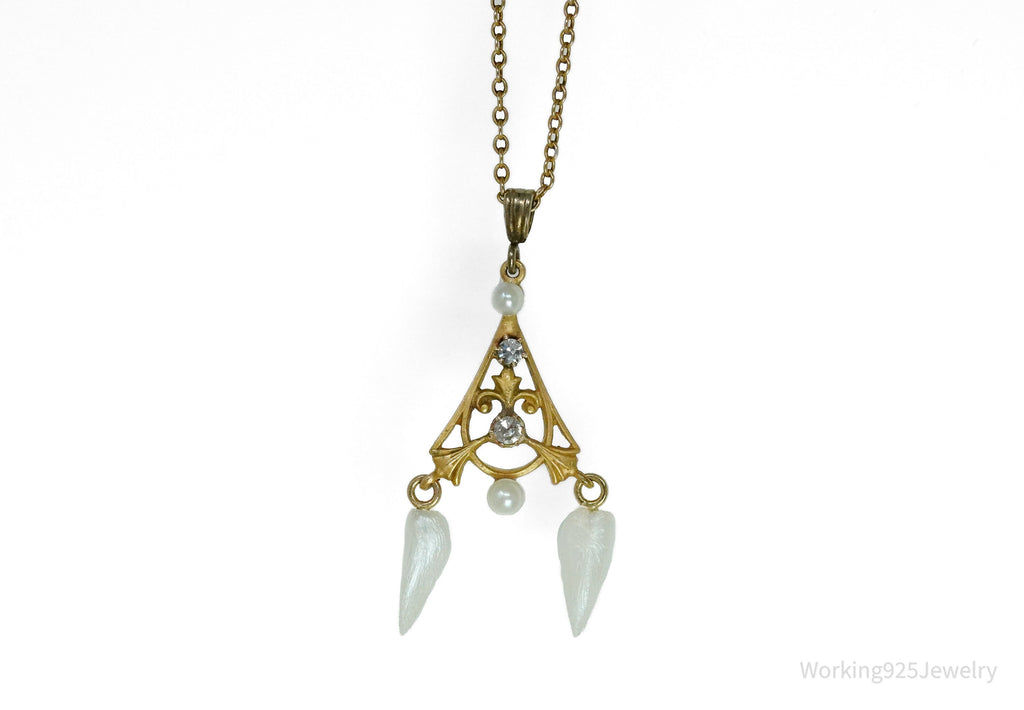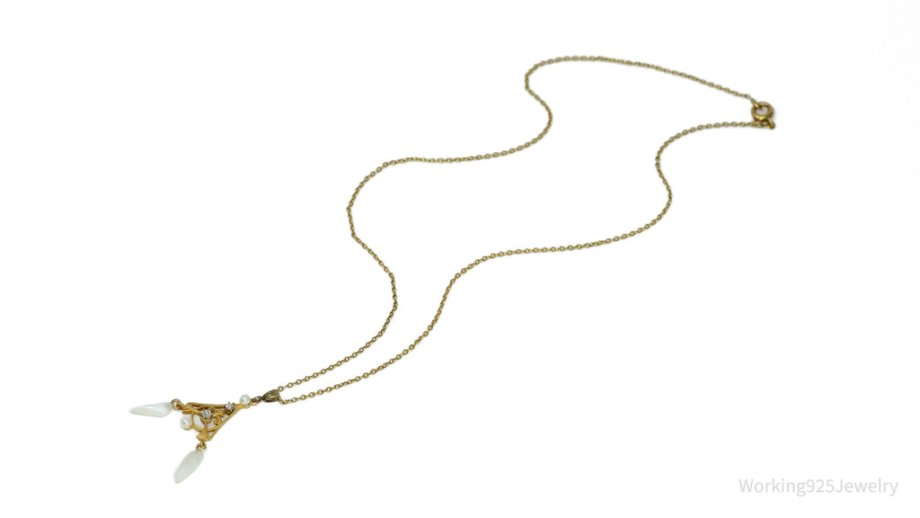 One (1) stamped 14K yellow gold pendant and chain are post-set with the two (2) river pearls described above. The pendant is accented with two(2) post set, cultured saltwater pearls measuring 2.5mm & 3.0mm with white body color. The pearls are also a six-prong set with two (2) round single-cut diamonds described below. The pendant measures 34.5mm long by 13.4mm wide on a 16-inch long cable link chain, finished with a spring ring clasp.