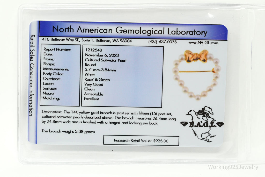 The 14K yellow gold brooch is post-set with fifteen (15) post-set, cultured saltwater pearls described above. The brooch measures 26.4mm long by 24.8mm wide and is finished with a hinged and locking pin back.