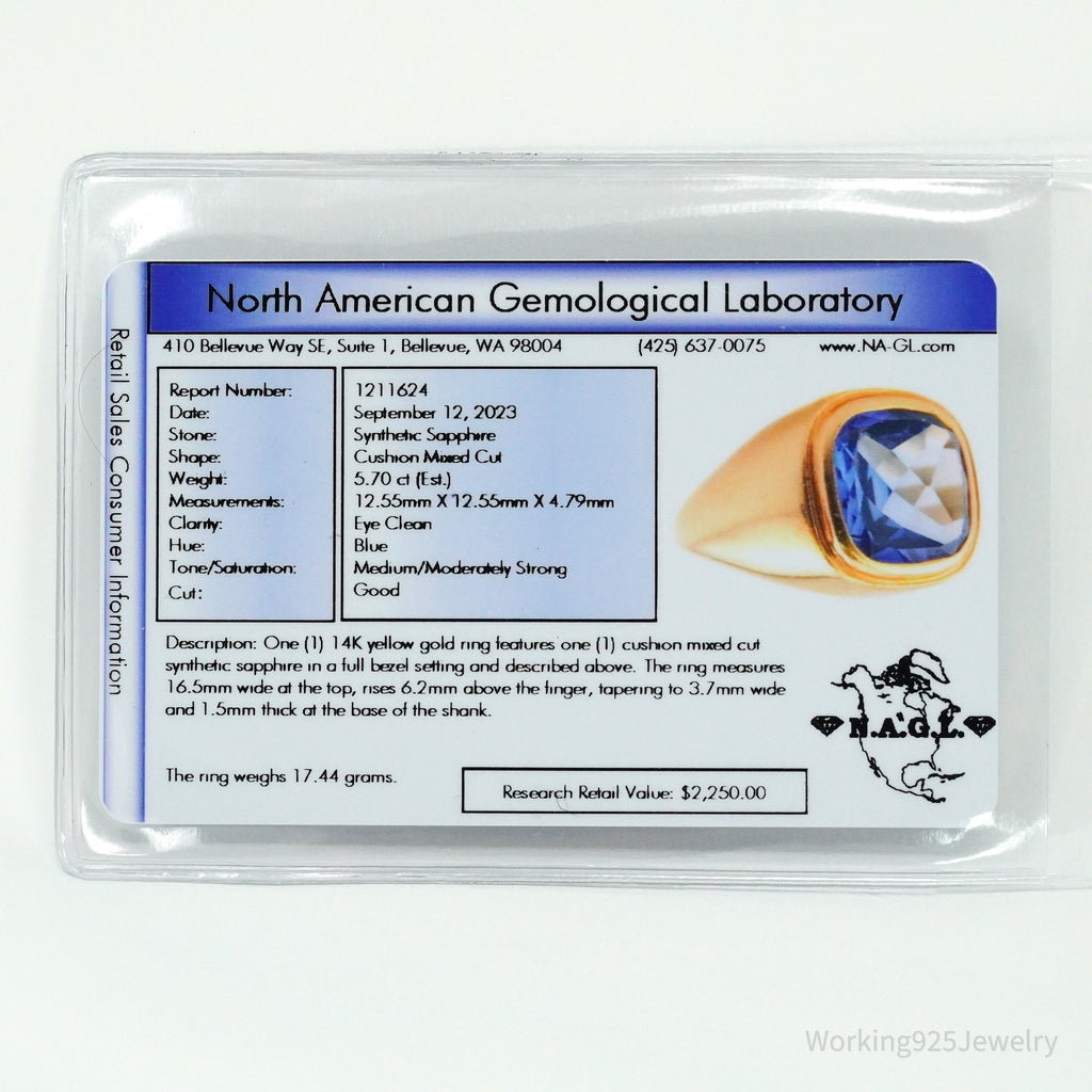 14K yellow gold ring features one (1) cushion mixed cut synthetic sapphire in a full bezel setting as described above. The ring measures 16.5mm wide at the top, and rises 6.2mm above the finger, tapering to 3.7mm wide and 1.5mm thick at the base of the shank.