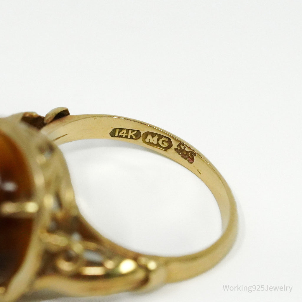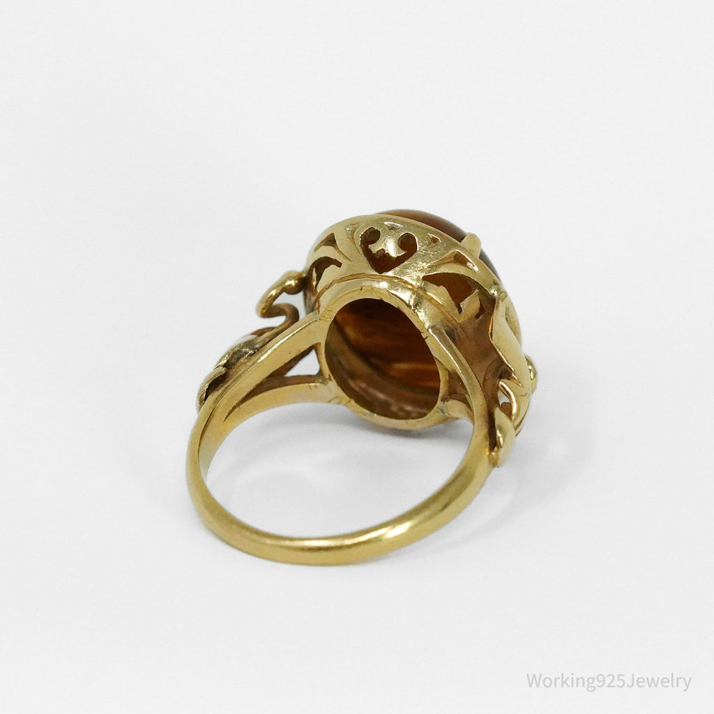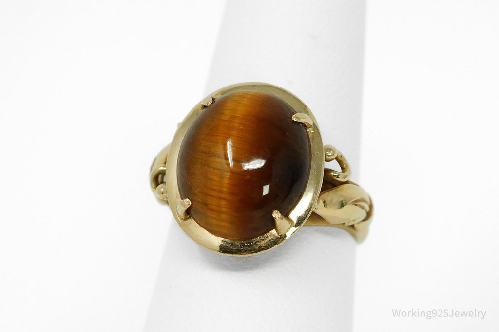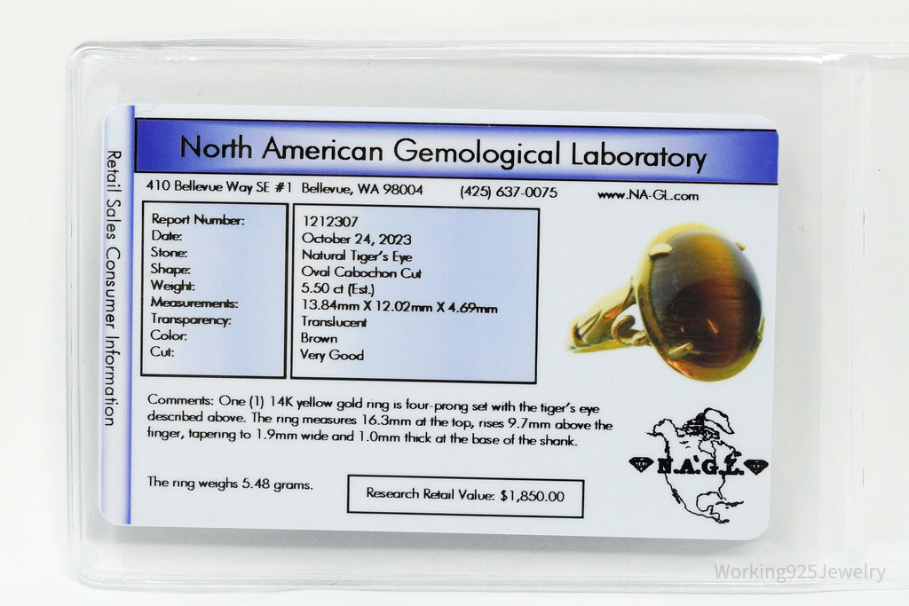 One (1) 14K yellow gold ring is a four-prong set with the tiger's eye described above. The ring measures 16.3mm at the top, rises 9.7 mm above the finger, tapering to 1.9mm wide and 1.0mm thick at the base of the shank.