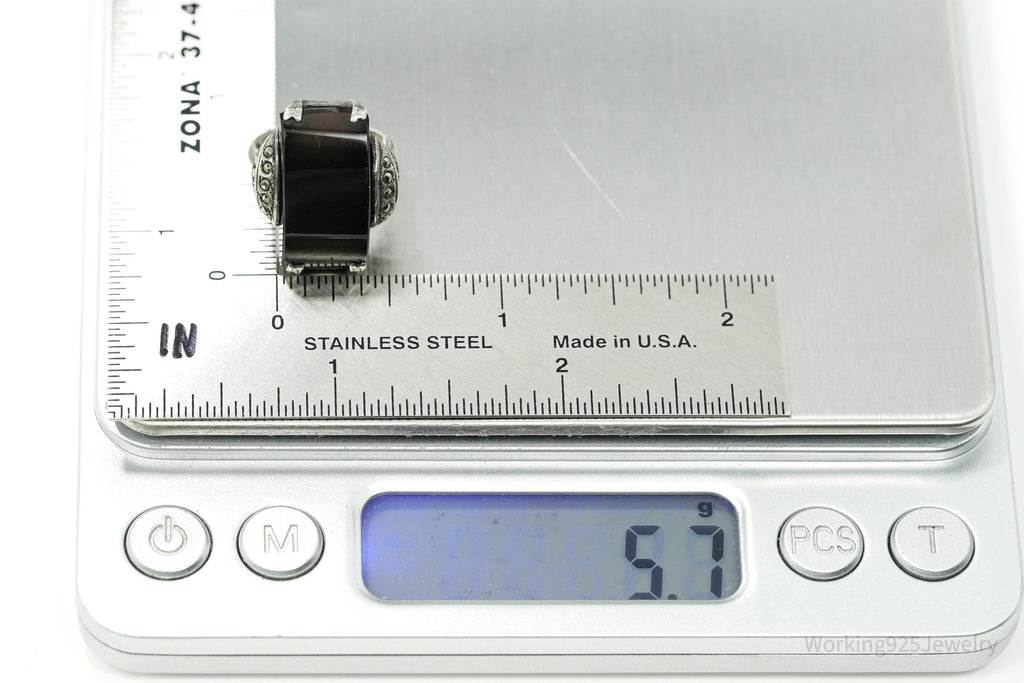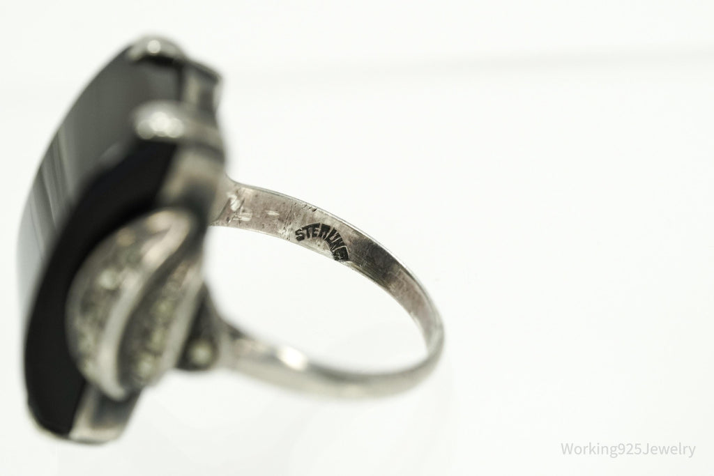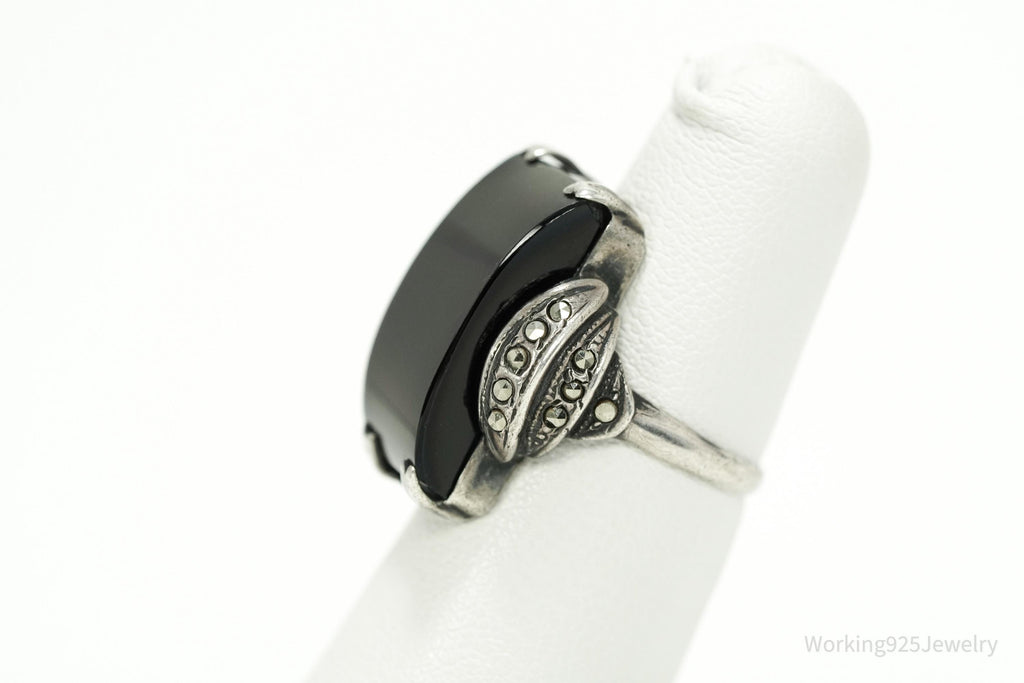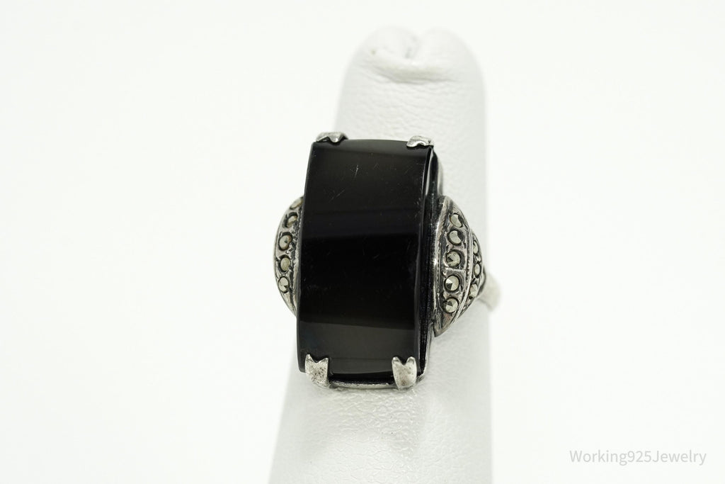 Antique Art Deco Black Onyx & Marcasite Sterling Silver Ring - Size 4.5