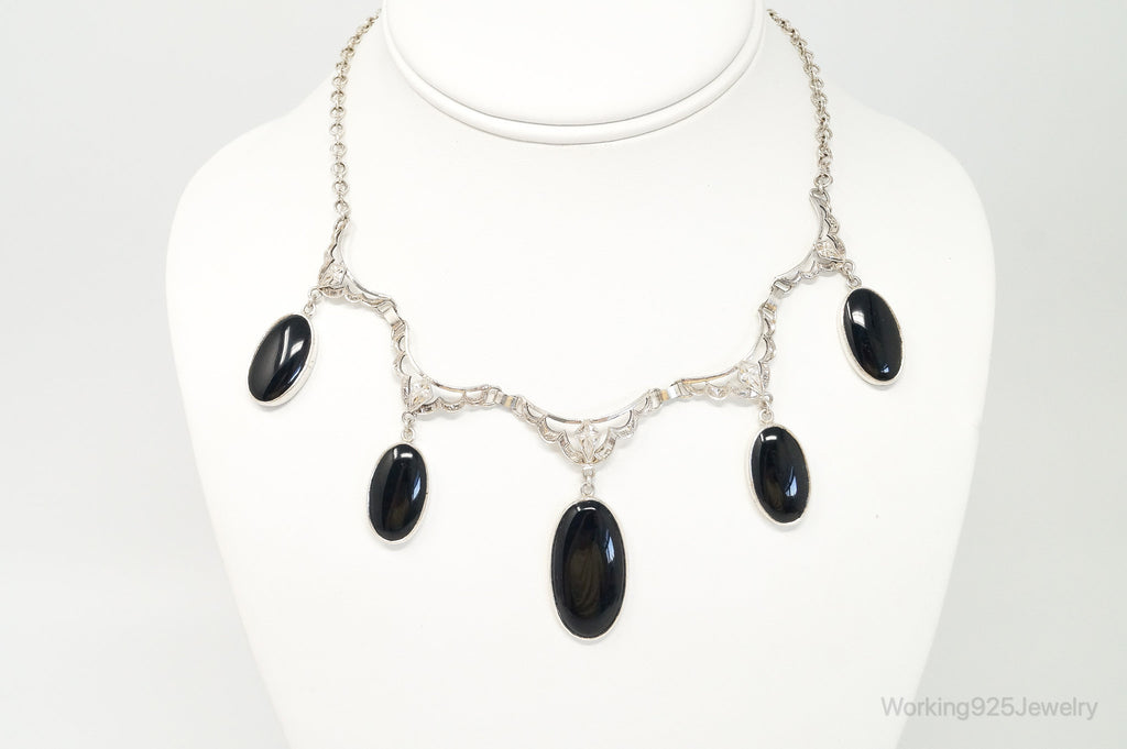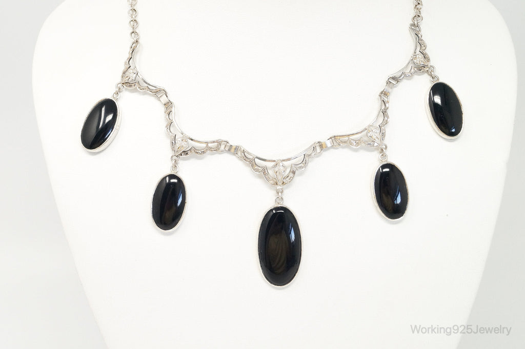 Antique Black Onyx Art Deco Silver Bib Necklace