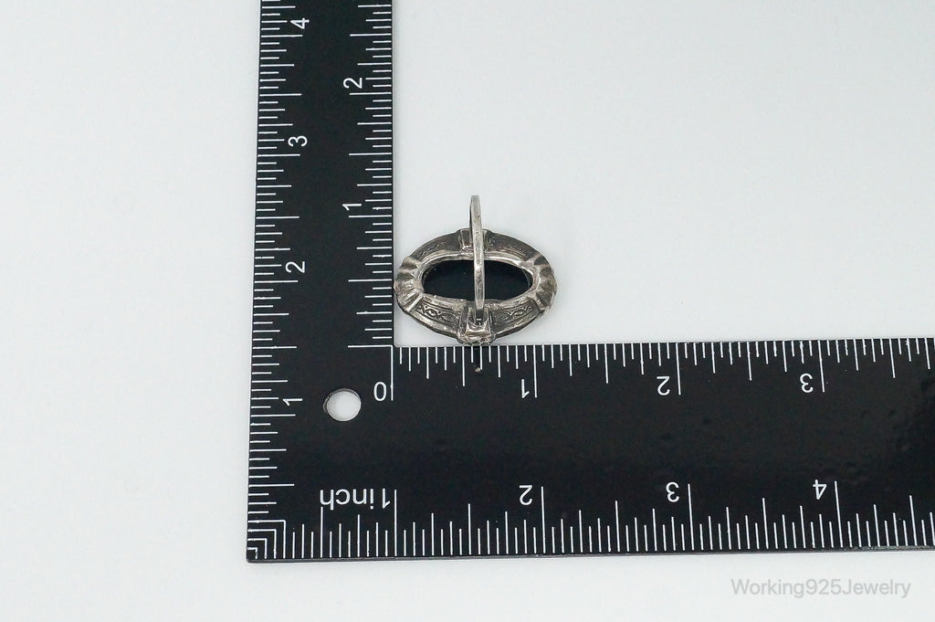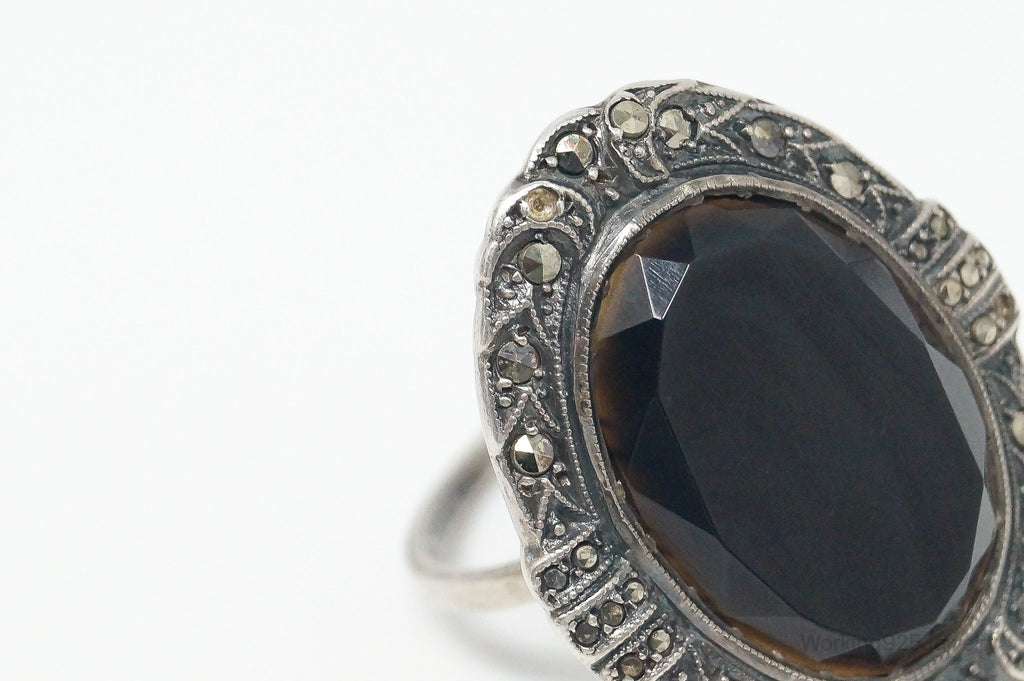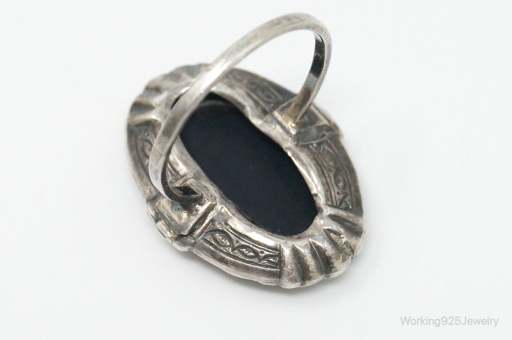Antique Black Onyx Marcasite Sterling Silver Ring - Size 10.25