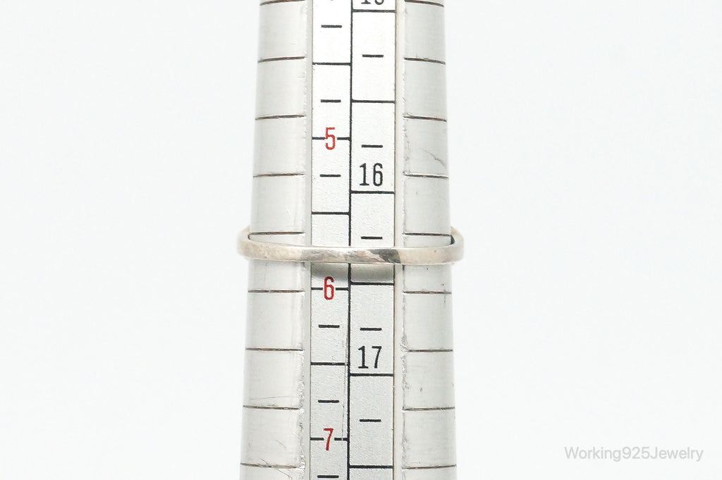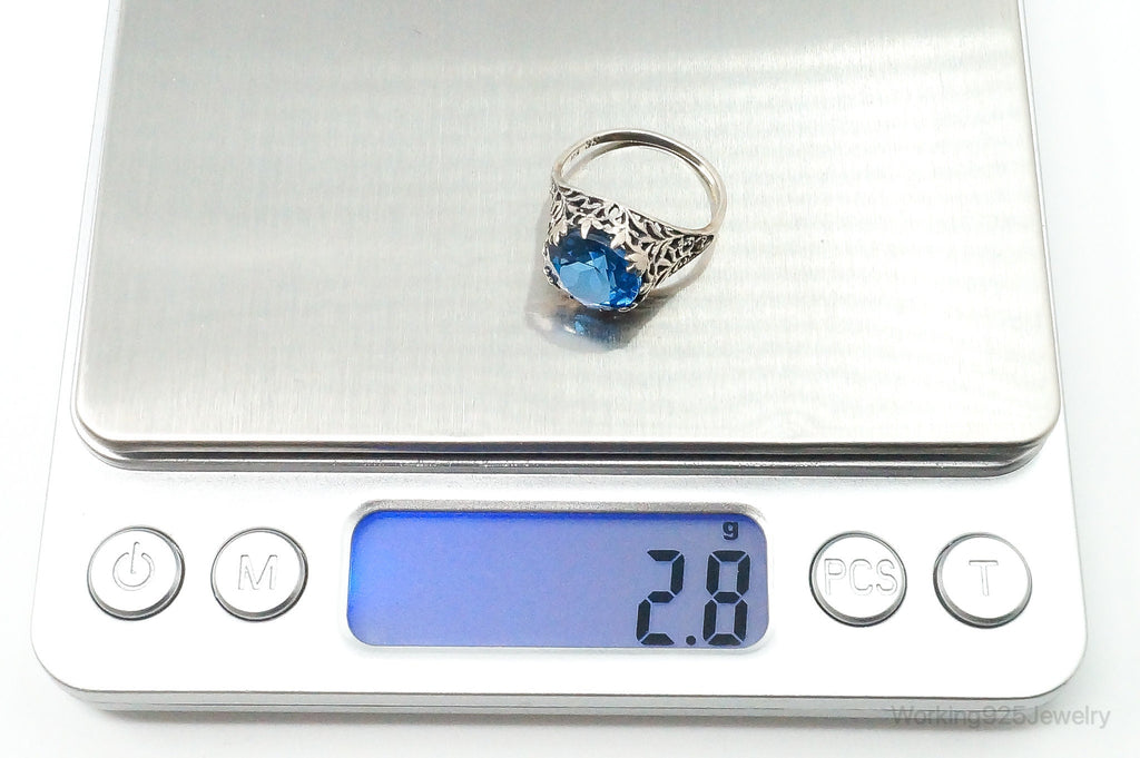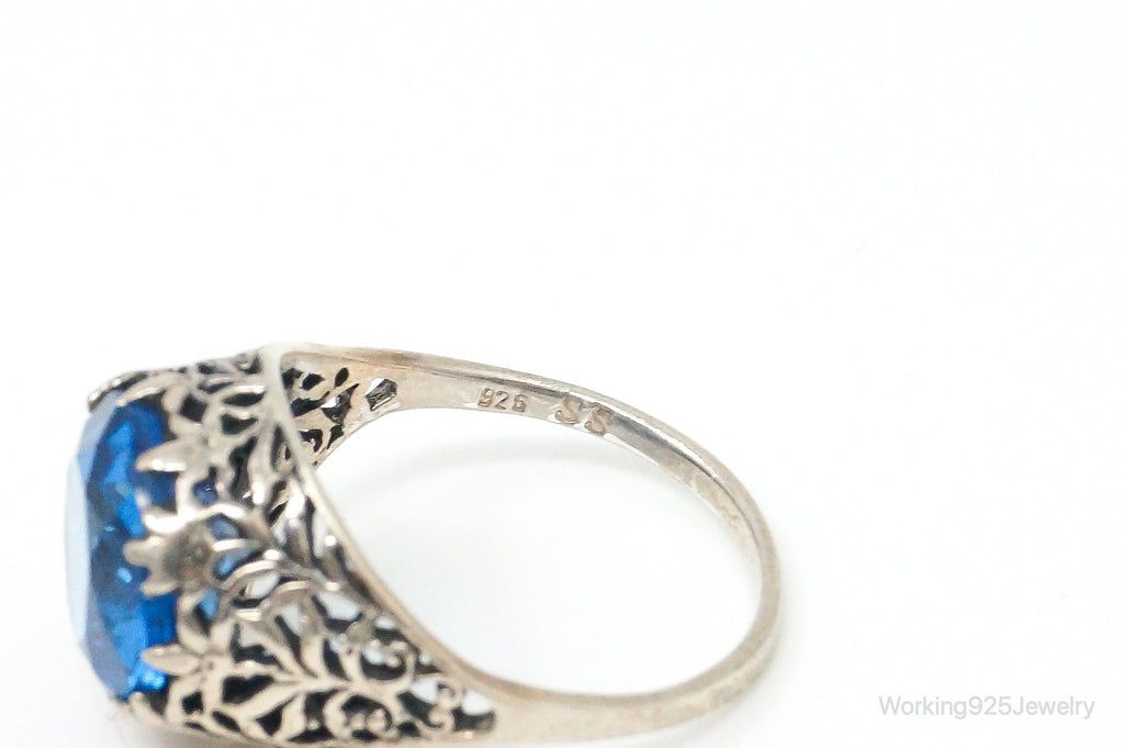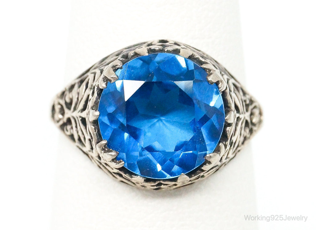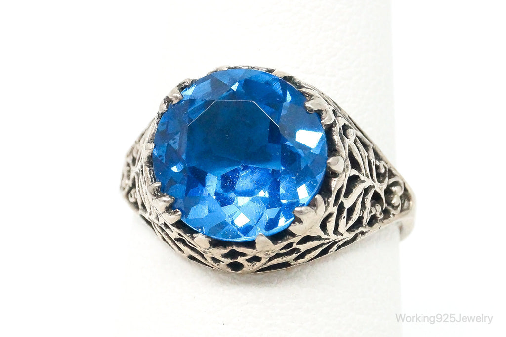 Antique Bright Blue Glass Round Solitaire Sterling Silver Ring Size 5.75