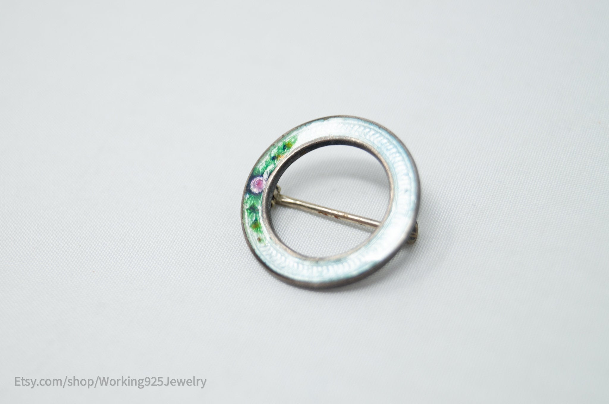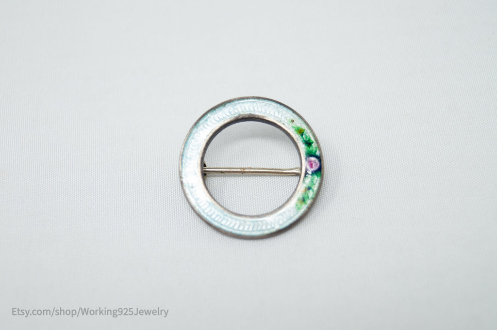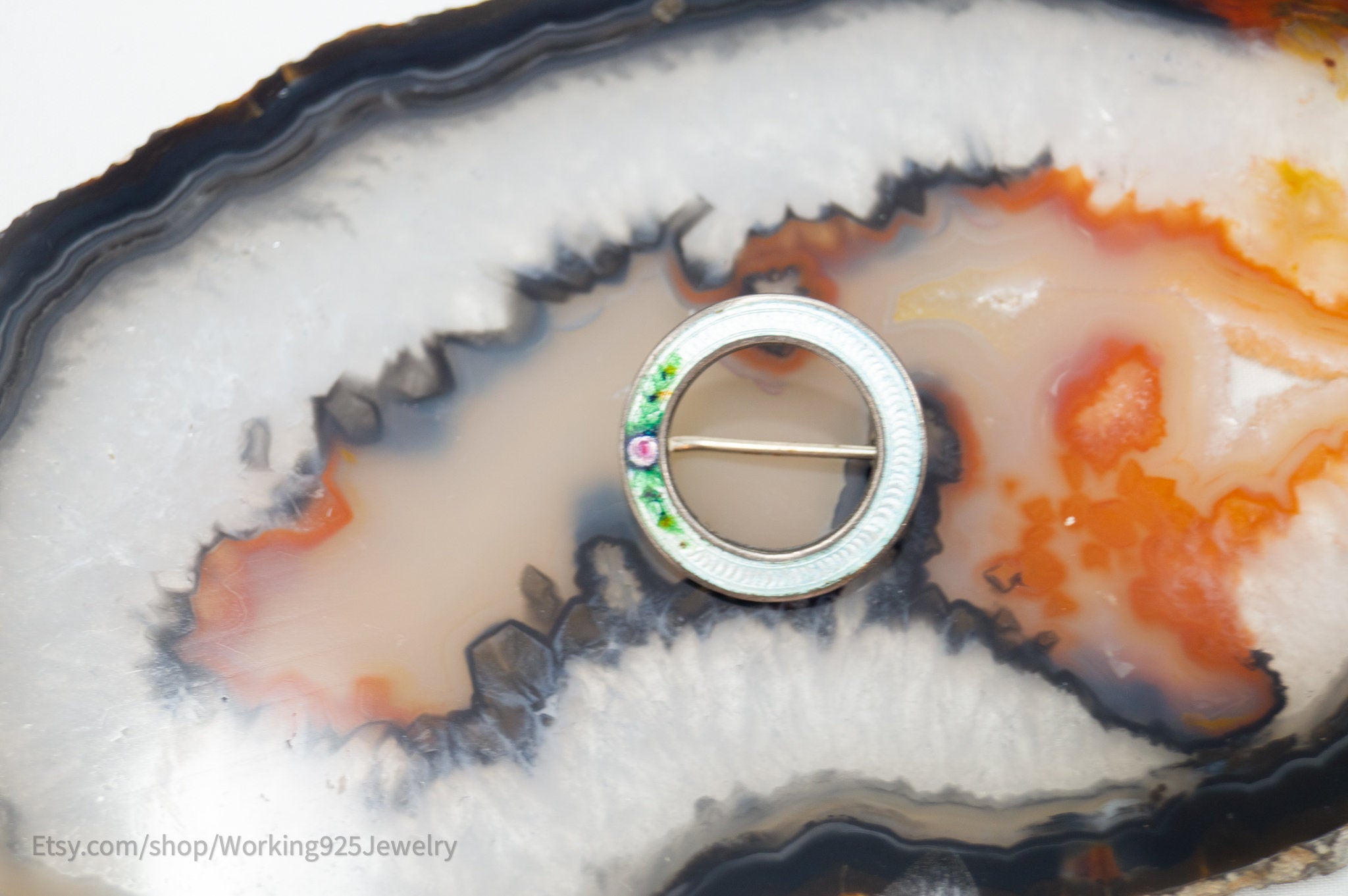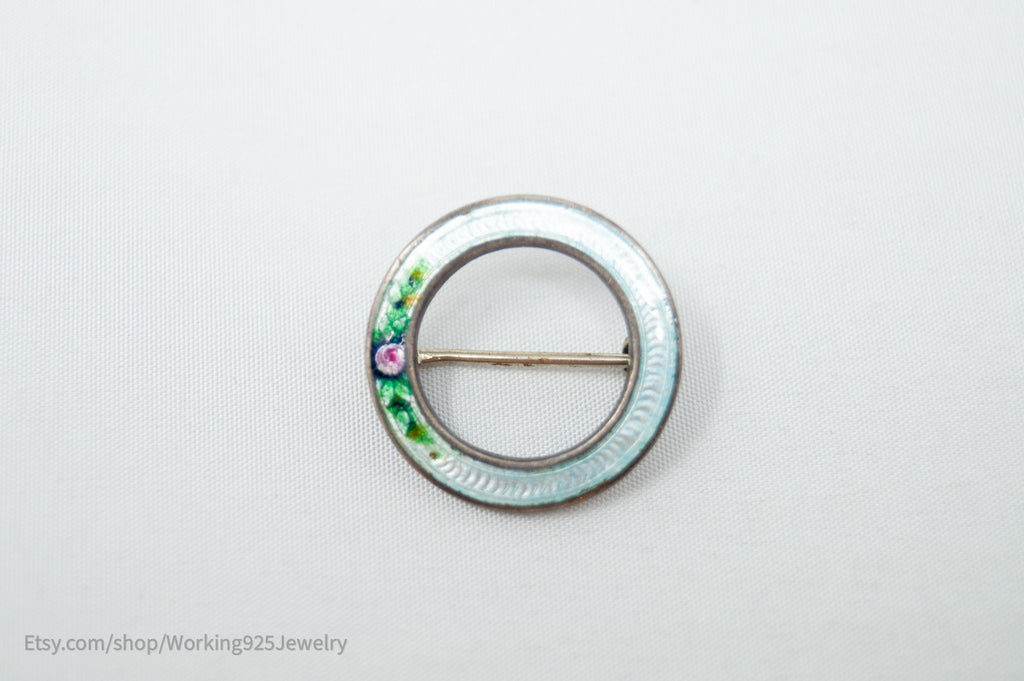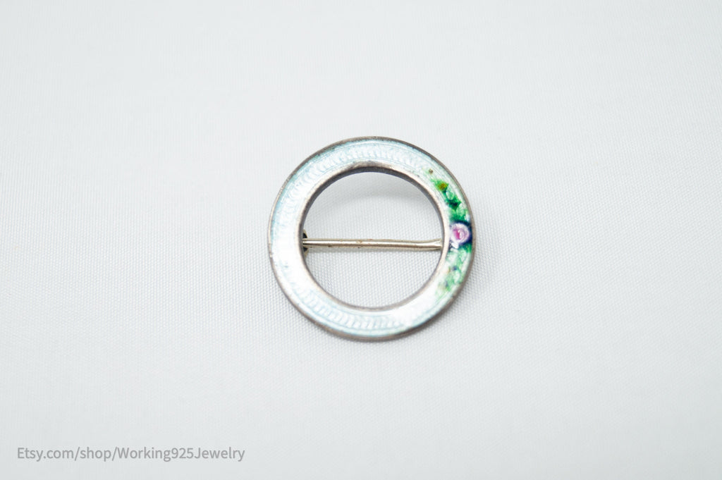 Antique Designer White Blue Guilloche Enamel Scarf Sterling Silver Brooch Pin