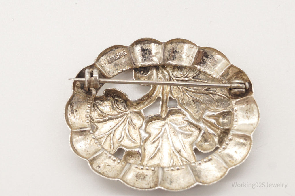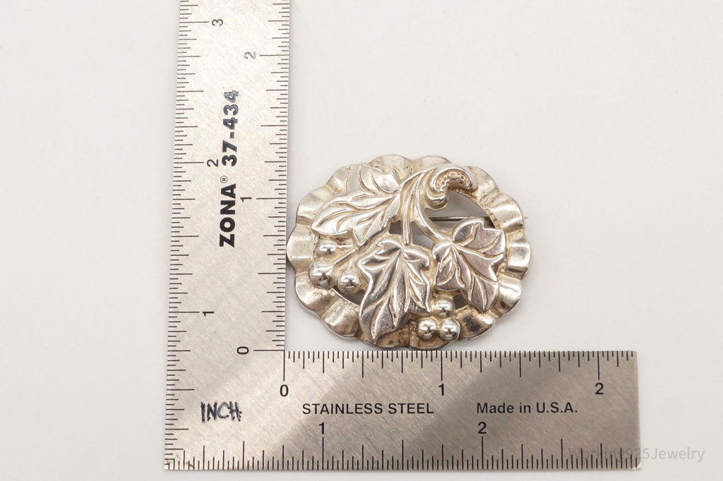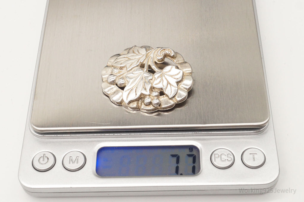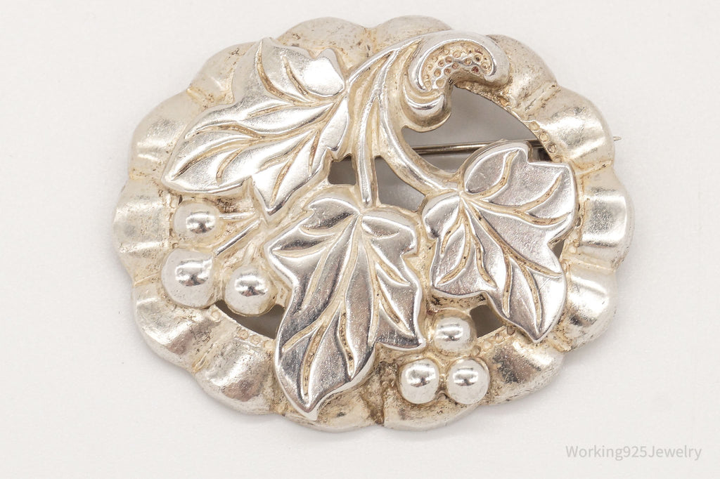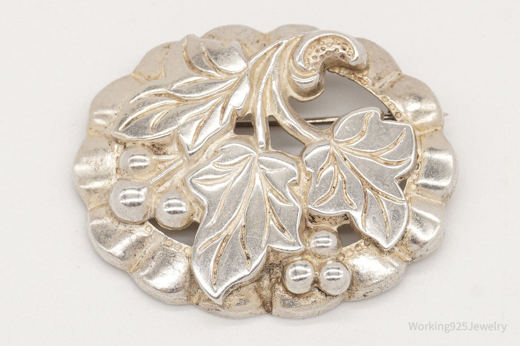 Antique Ivy & Berries Repousse Sterling Silver Pin Brooch