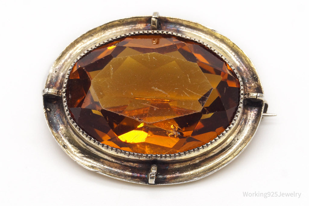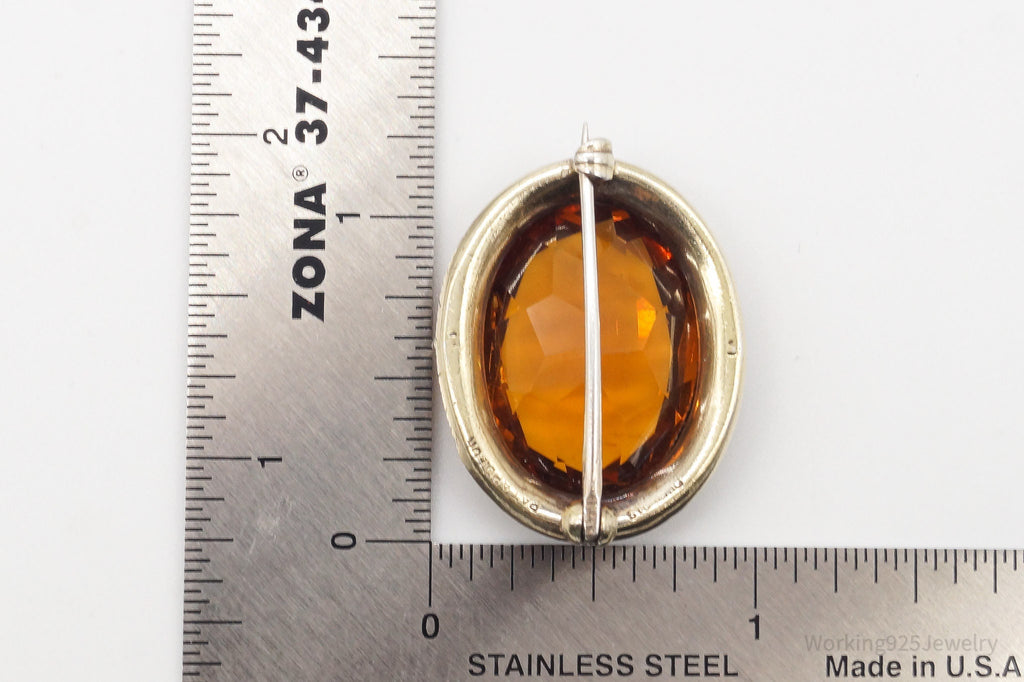 Antique Large Orange Glass Gold Tone Sterling Silver Brooch Pin