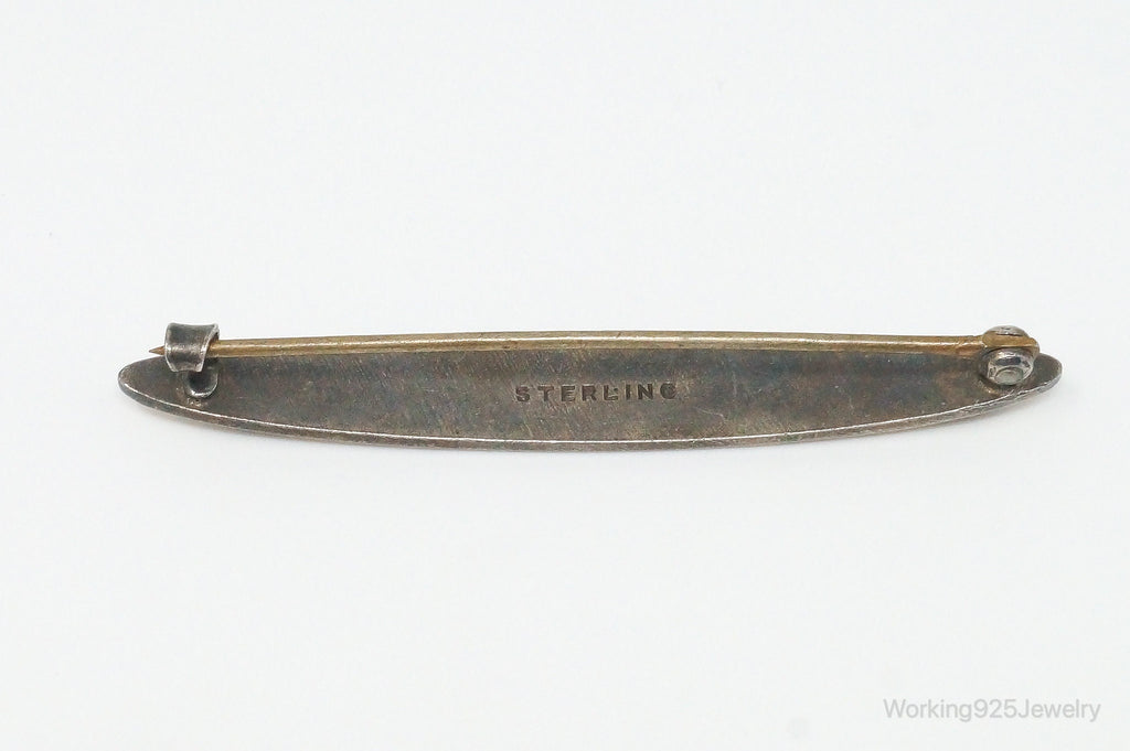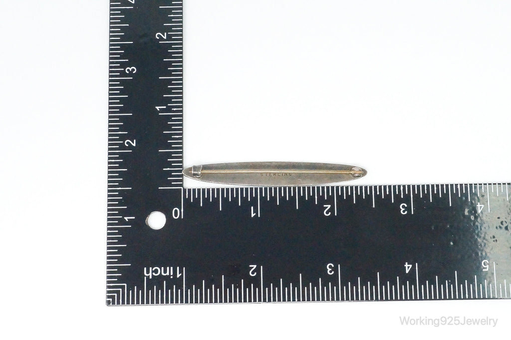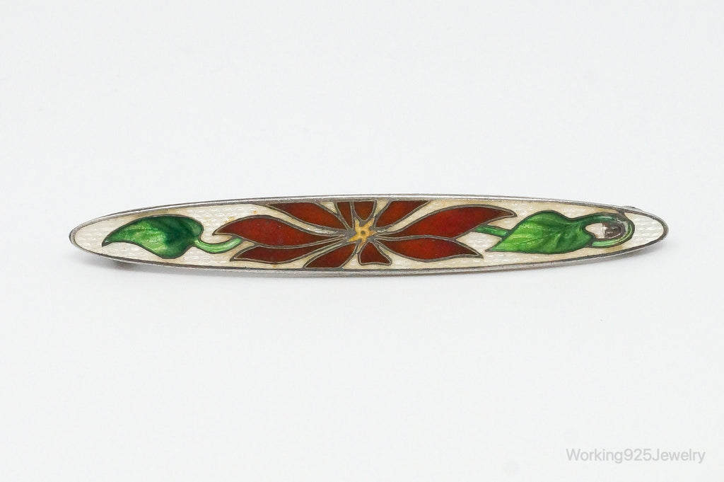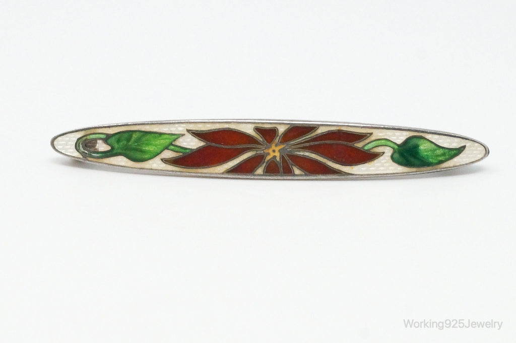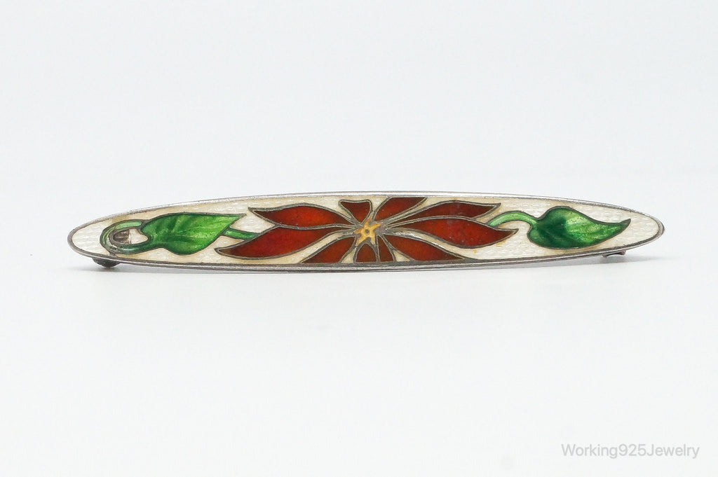 Antique Red Flower & Vine Enamel Scarf Sterling Silver Brooch Pin