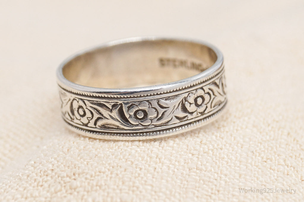 Antique Uncas Mfg. Co. Flowers Pattern Sterling Silver Band Ring - Size 6.75