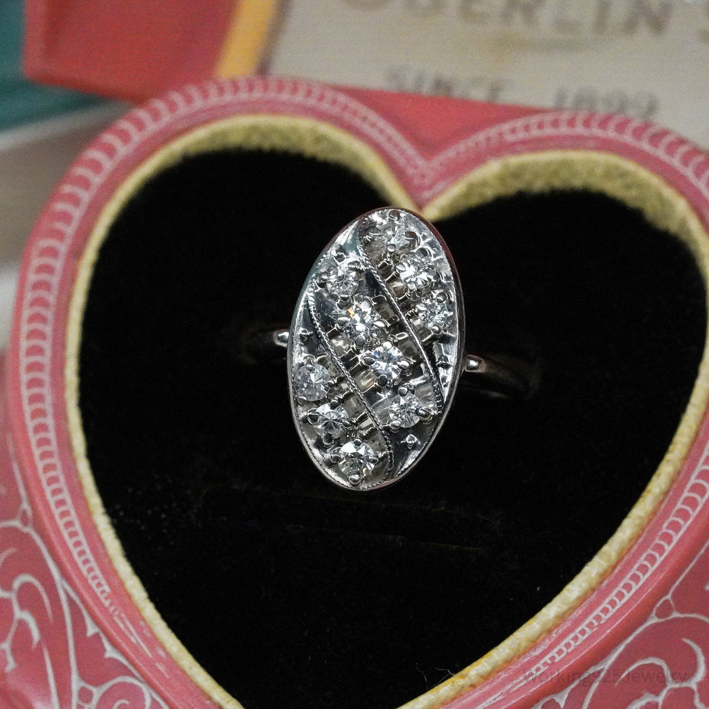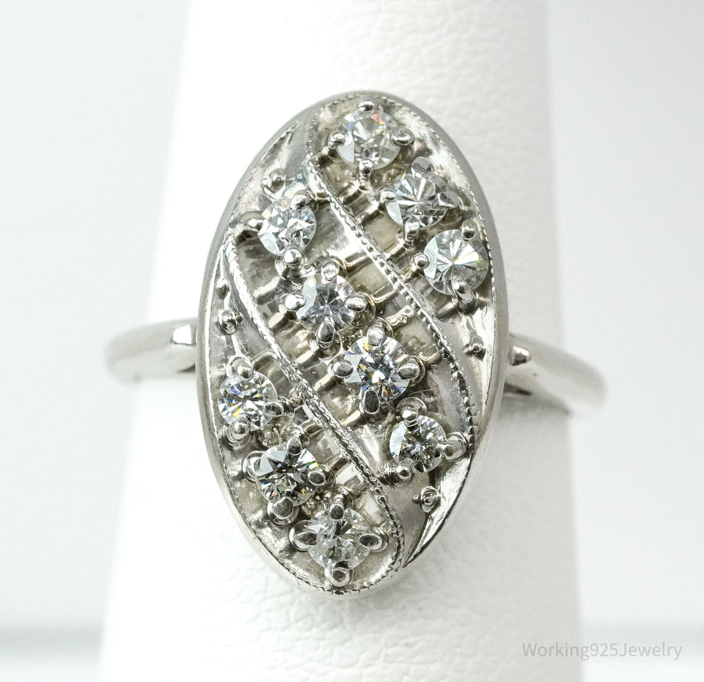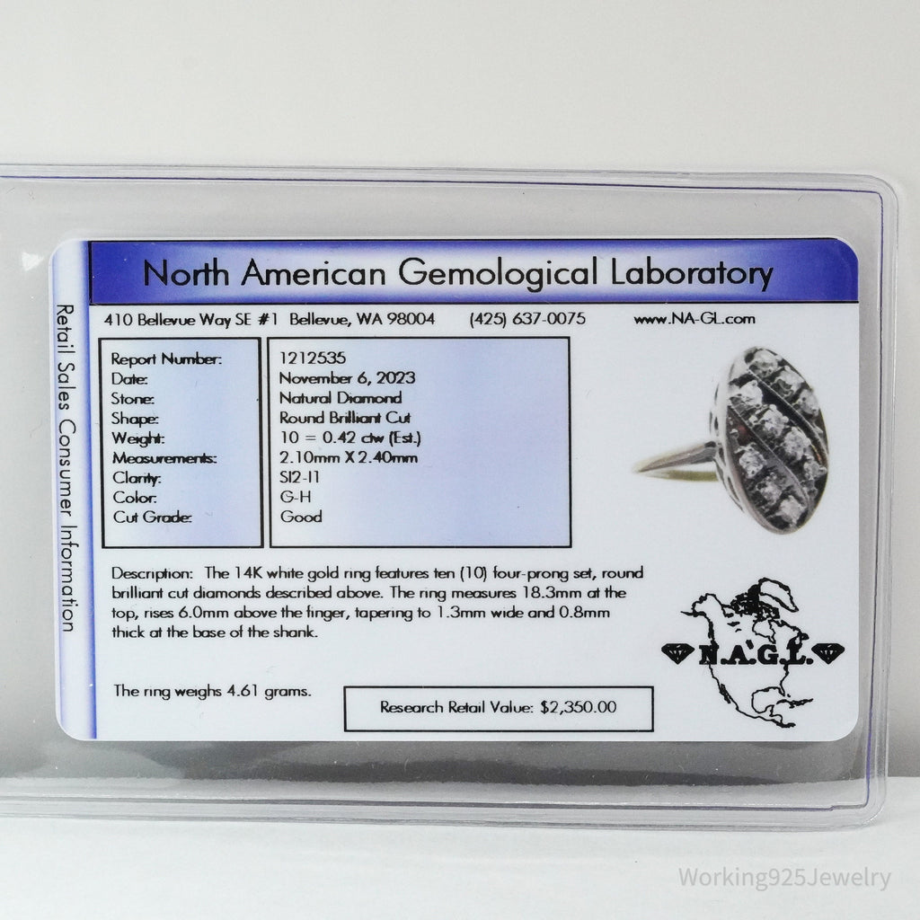 The 14K white gold ring features ten (10) four-prong set, round brilliant cut diamonds described above. The ring measures 18.3mm at the top, and rises 6.0mm above the finger, tapering to 1.3mm wide and 0.8mm thick at the base of the shank.