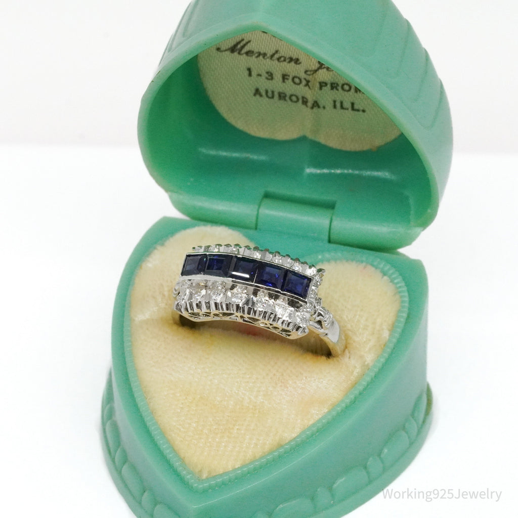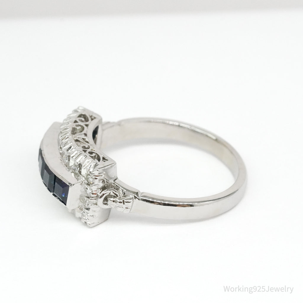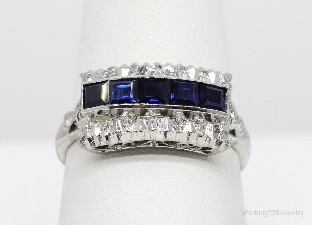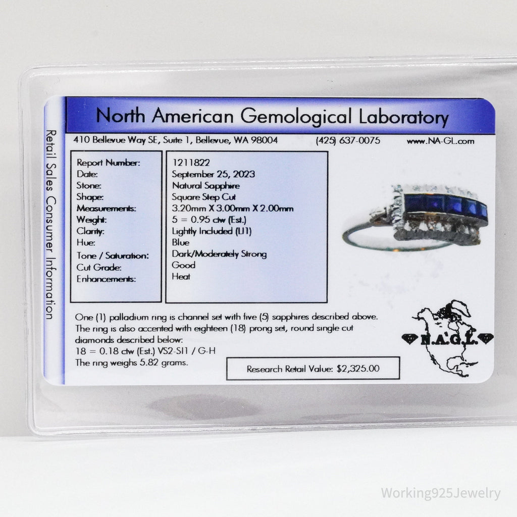 One (1) palladium ring is channel set with tive (5) sapphires described above. The ring is also accented with eighteen (18) prong set, round single cut diamonds described below: 18 = 0.18 ctw (Est.) VS2-SI1 / G-H The ring weighs 5.82 grams.