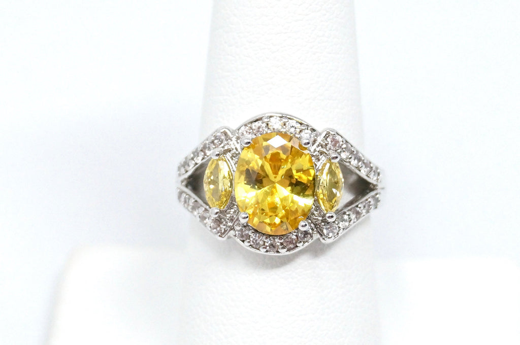Art Deco Vintage Large Citrine Cz Accented Statement Ring Sterling Silver Sz 8