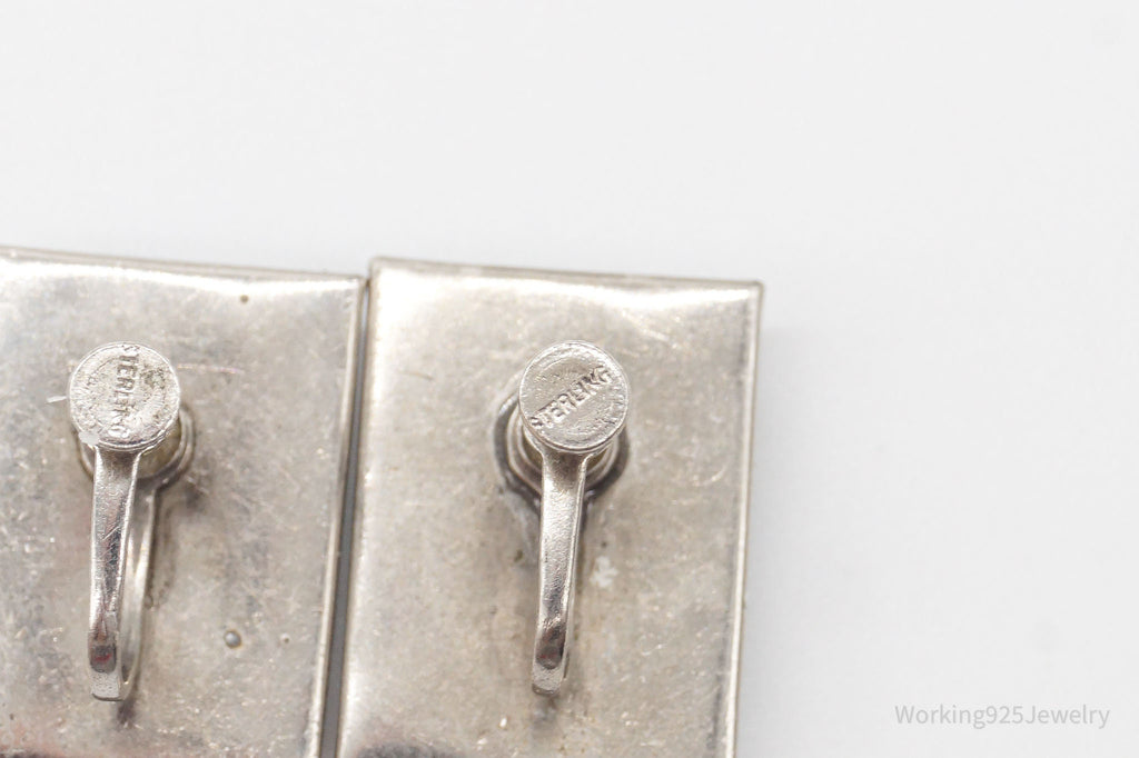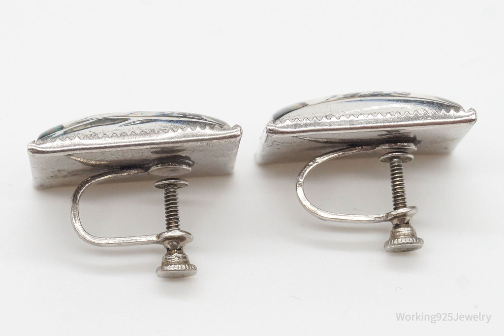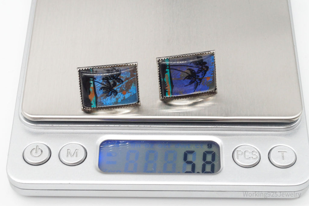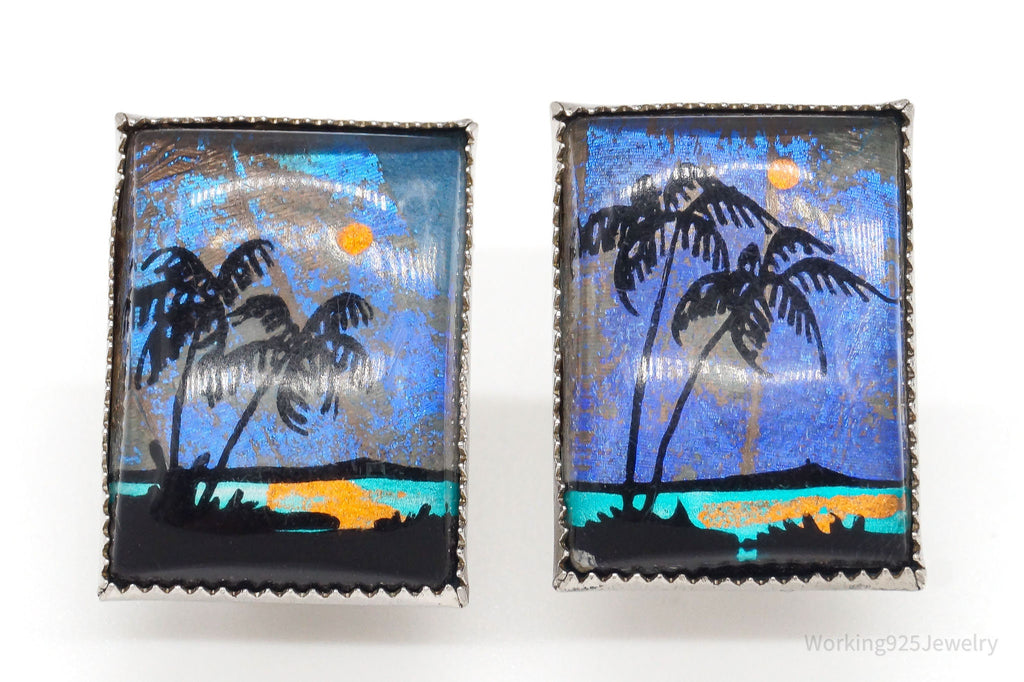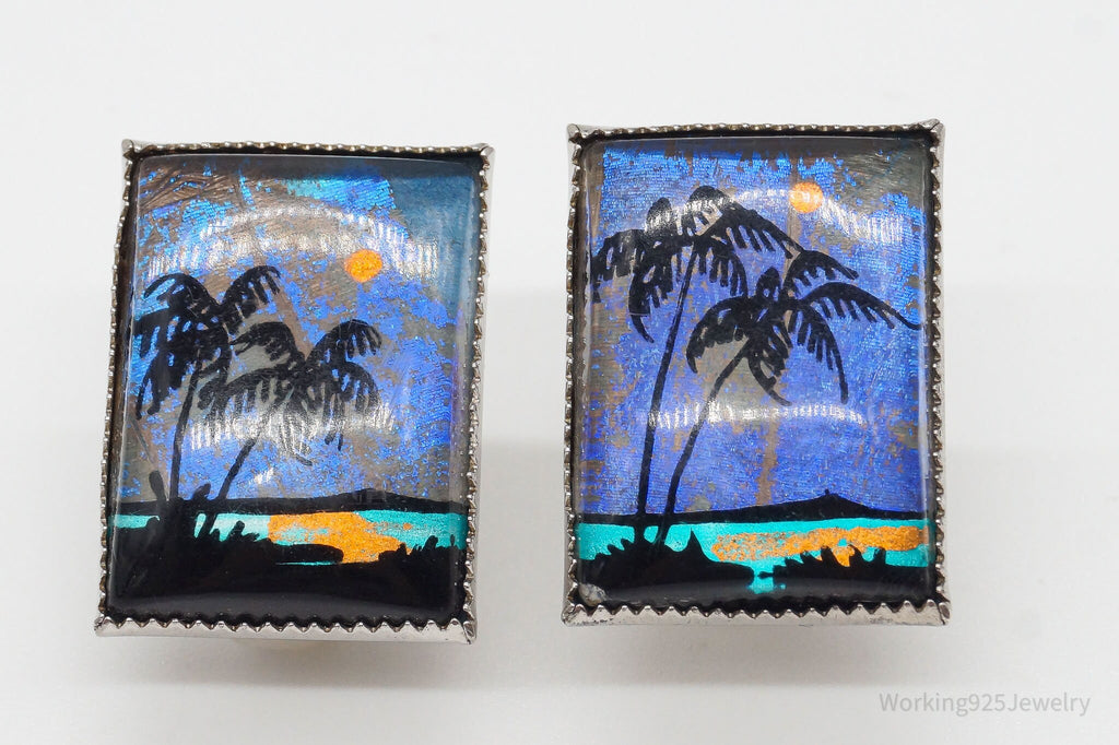 ATQ VTG Painted Butterfly Wings Beach Scene Sterling Silver Screw Back Earrings
