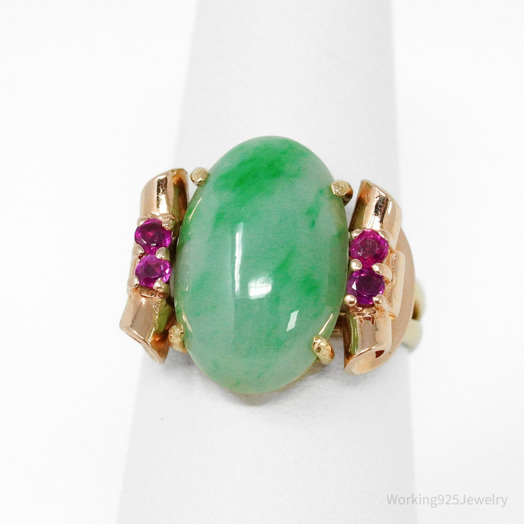 Circa 1940s 14K Gold Jadeite Jade & Natural Ruby Ring - Size 6