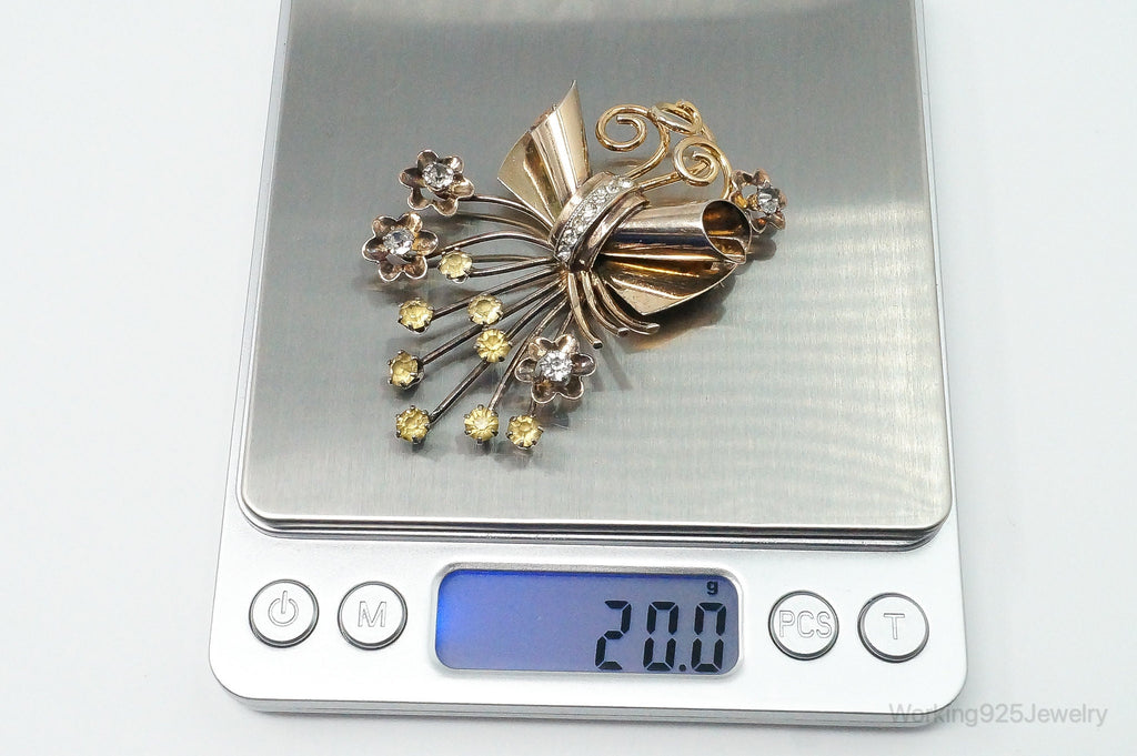 Large Antique Rhinestone Gold Tone Sterling Silver Brooch Pin