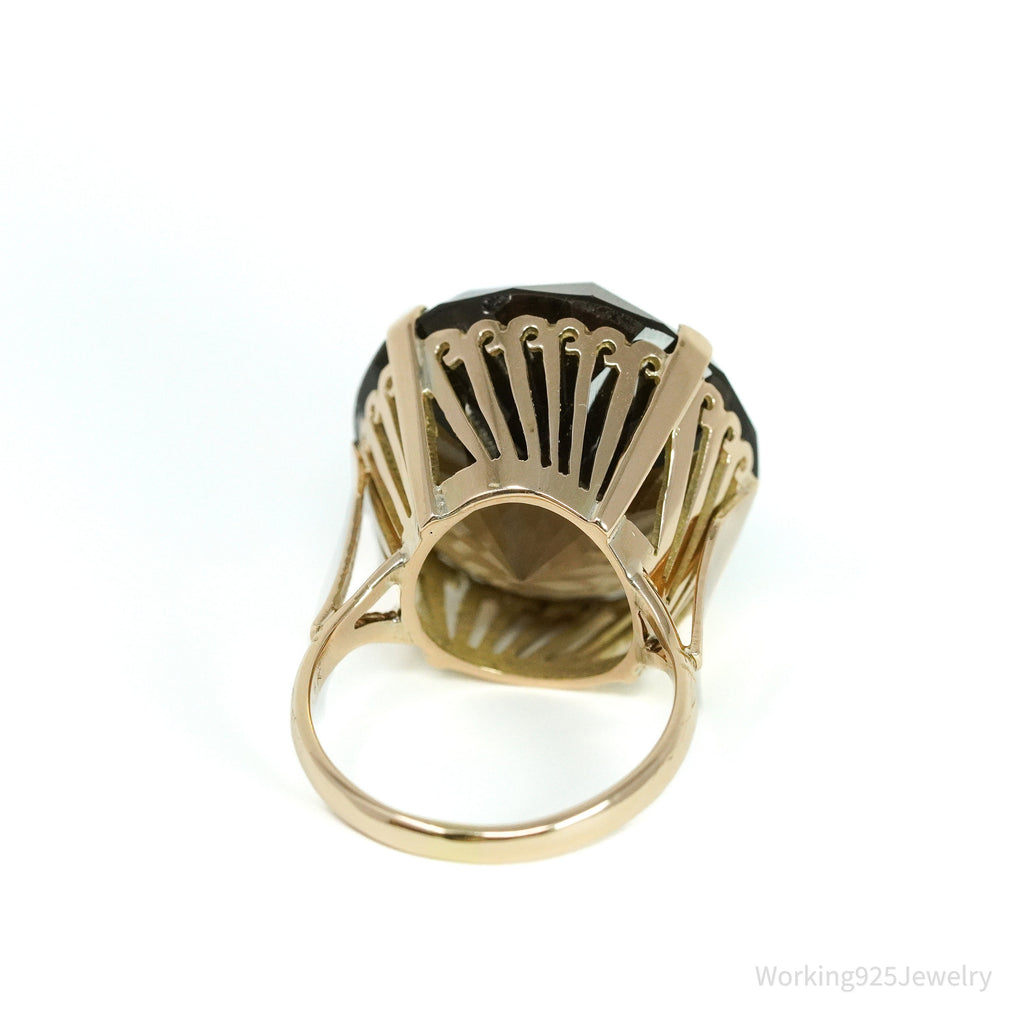 One (1) 14K yellow gold ring features one (1) round mixed cut smoky quartz set with four-prongs. The ring measures 21.7mm at the top, rises 15.6mm above the finger, tapering to 2.4mm wide and 1.1mm thick at the base of the shank. The ring weighs 12.45 grams. Research Retail Value: $2,025.00 Independent Appraisal Included. Pictured boxes are not included.