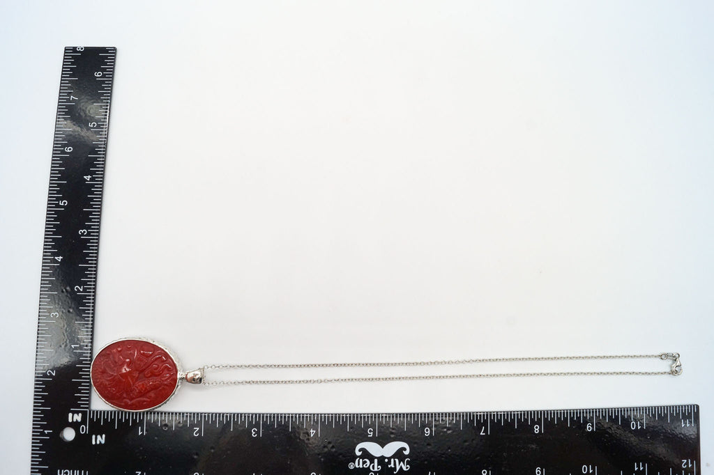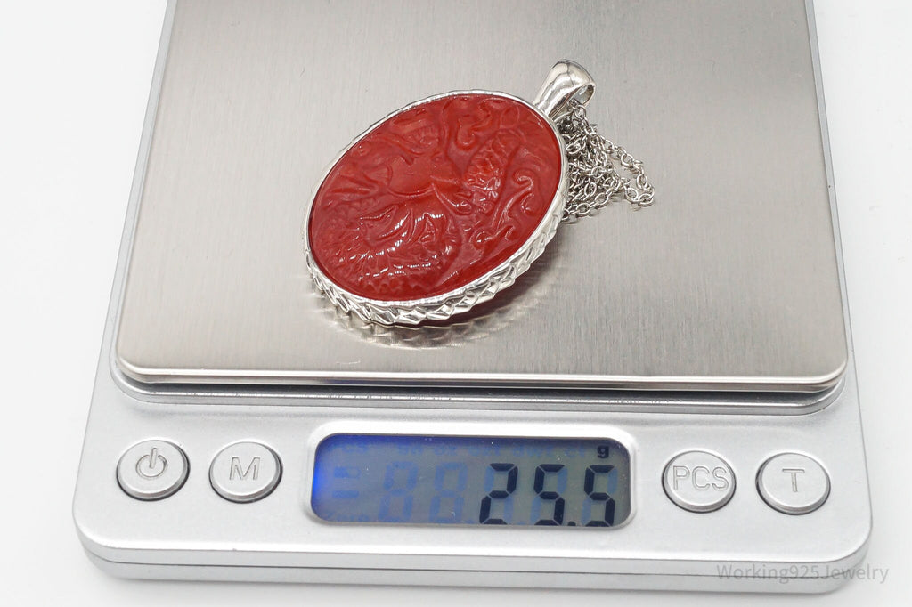 Large Vintage Carved Carnelian Dragon Sterling Silver Necklace