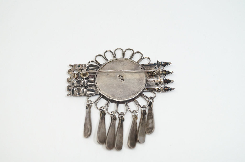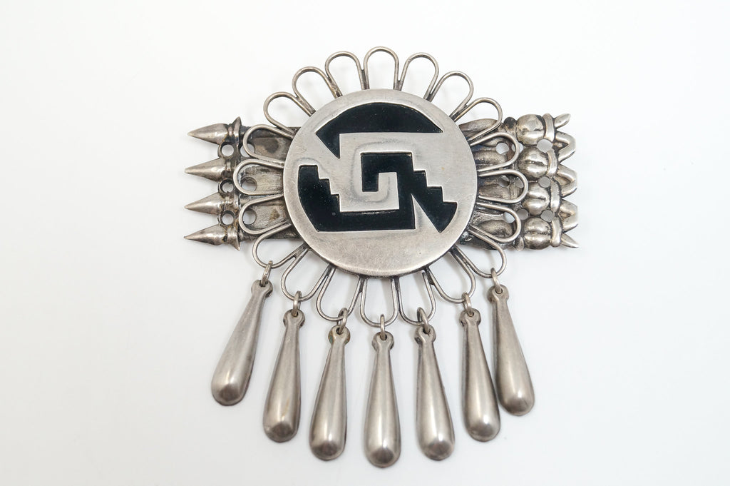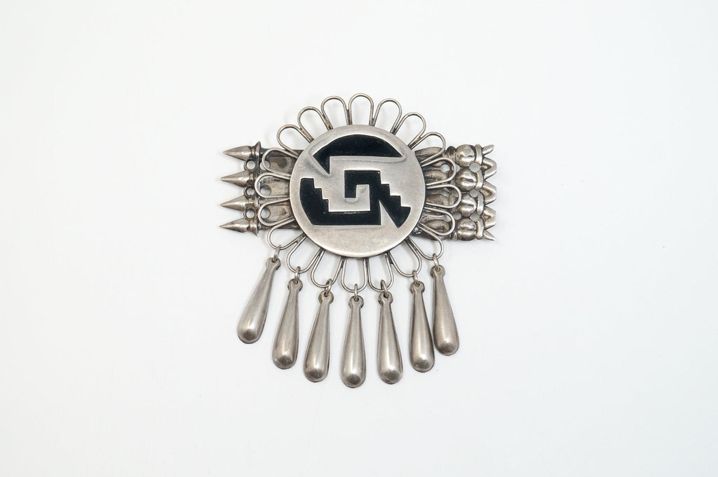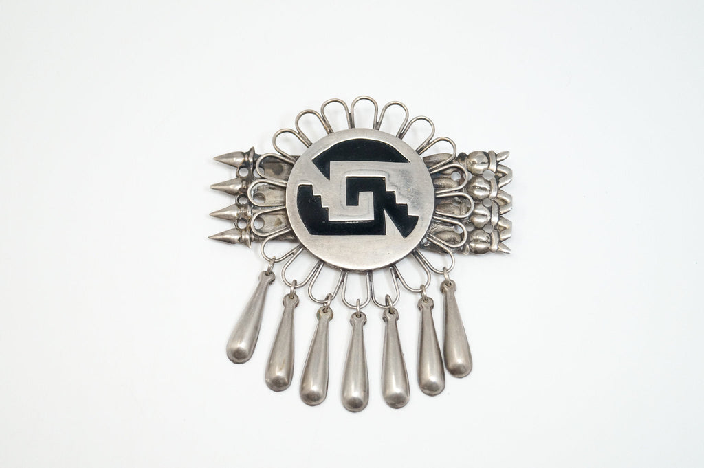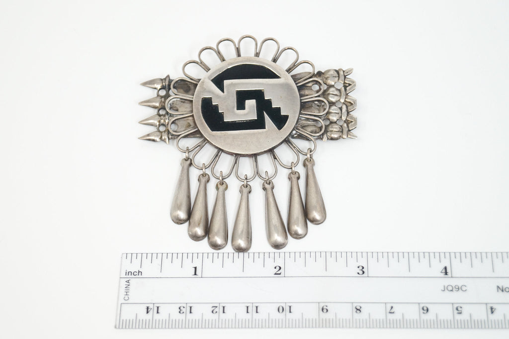 Large Vintage Mexico Handmade Aztec Dangle Silver Brooch Pin