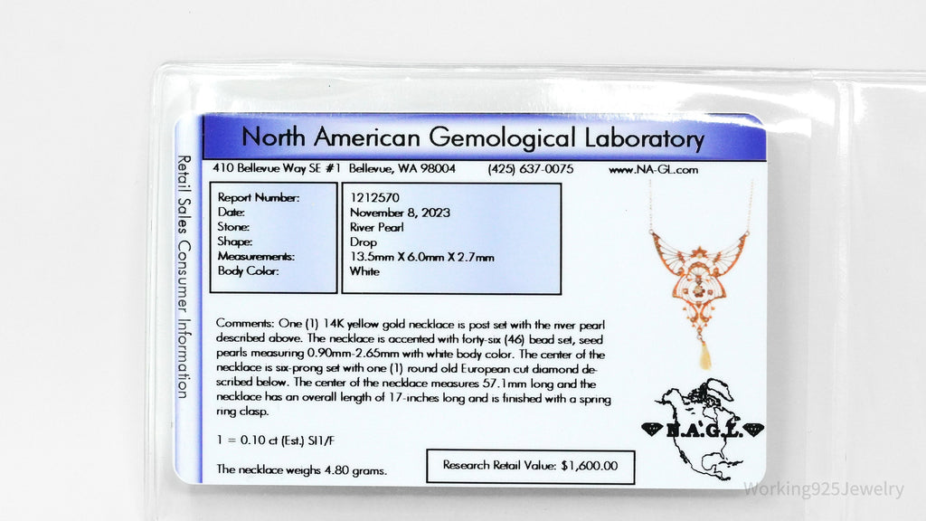 One (1) 14K yellow gold necklace is post set with the river pearl described above. The necklace is accented with forty-six (46) bead set, seed pearls measuring 0.90mm-2.65mm with a white body color. The center of the necklace is six-prong set with one (1) round old European cut diamond described below. The center of the necklace measures 57.1 mm long and the necklace has an overall length of 17 inches long and is finished with a spring ring clasp. 1 = 0.10 ct (Est) SI1/F