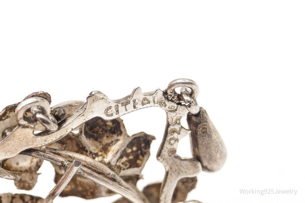 Rare Large Antique Bird & Flowers Faux Pearl And Stones Sterling Silver Pin