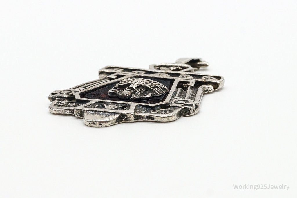 RARE Large Mexico Designer Aduna Aztec Leather Sterling Silver Pendant