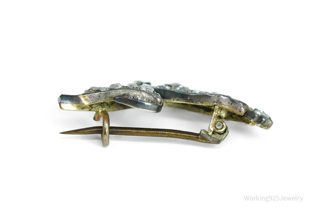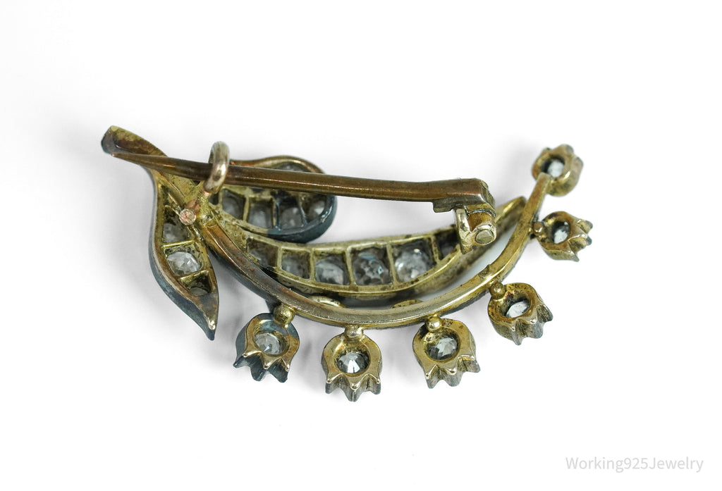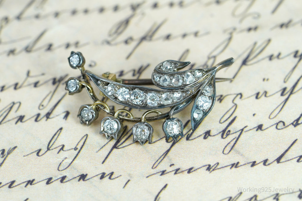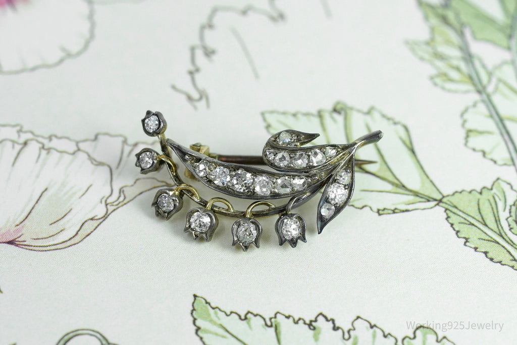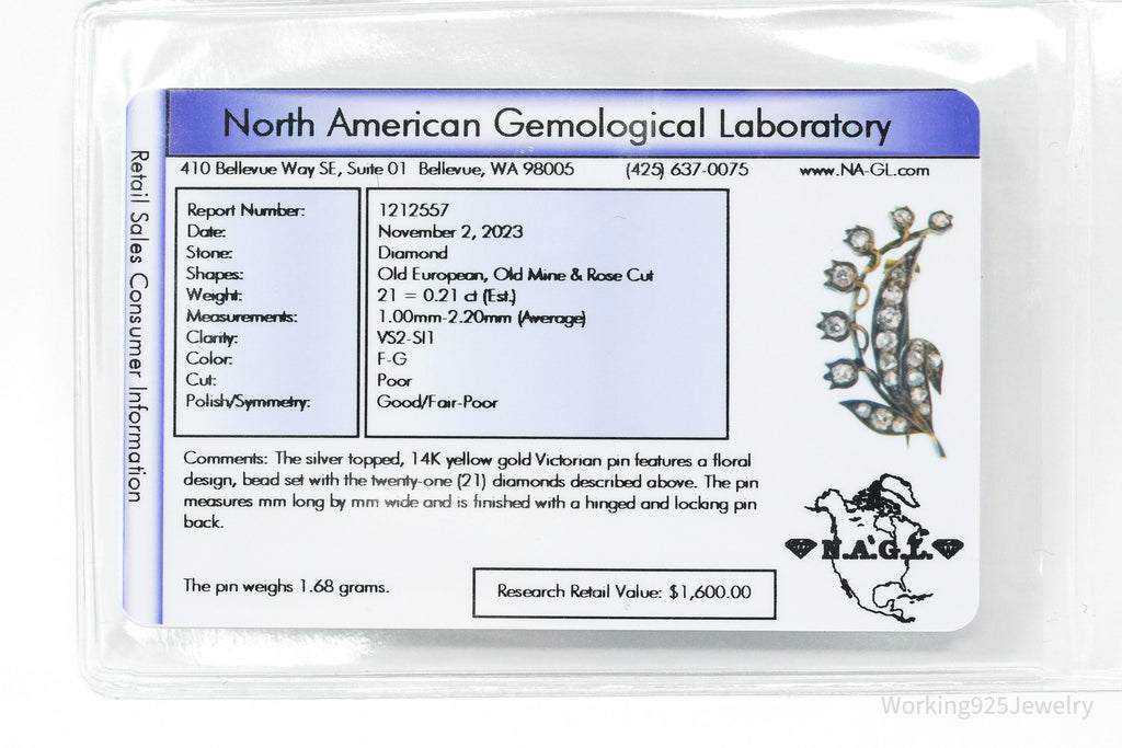 The silver-topped, 14K yellow gold Victorian pin features a floral design, bead set with the twenty-one (21) diamonds described above. The pin measures 22 mm long by 12 mm wide and is finished with a hinged and locking pin back.