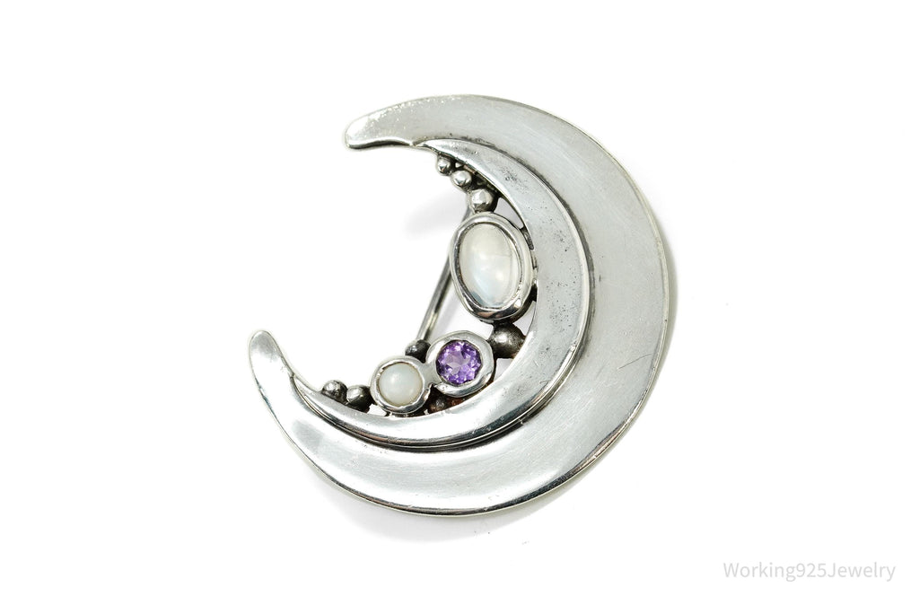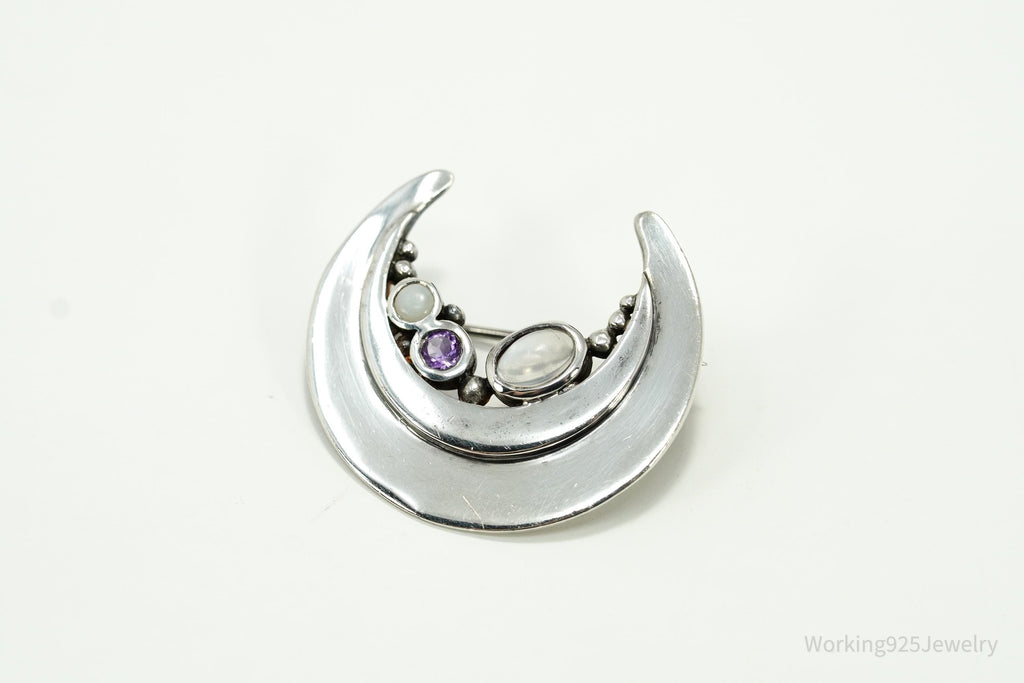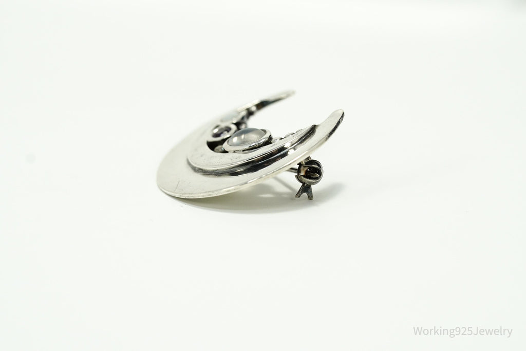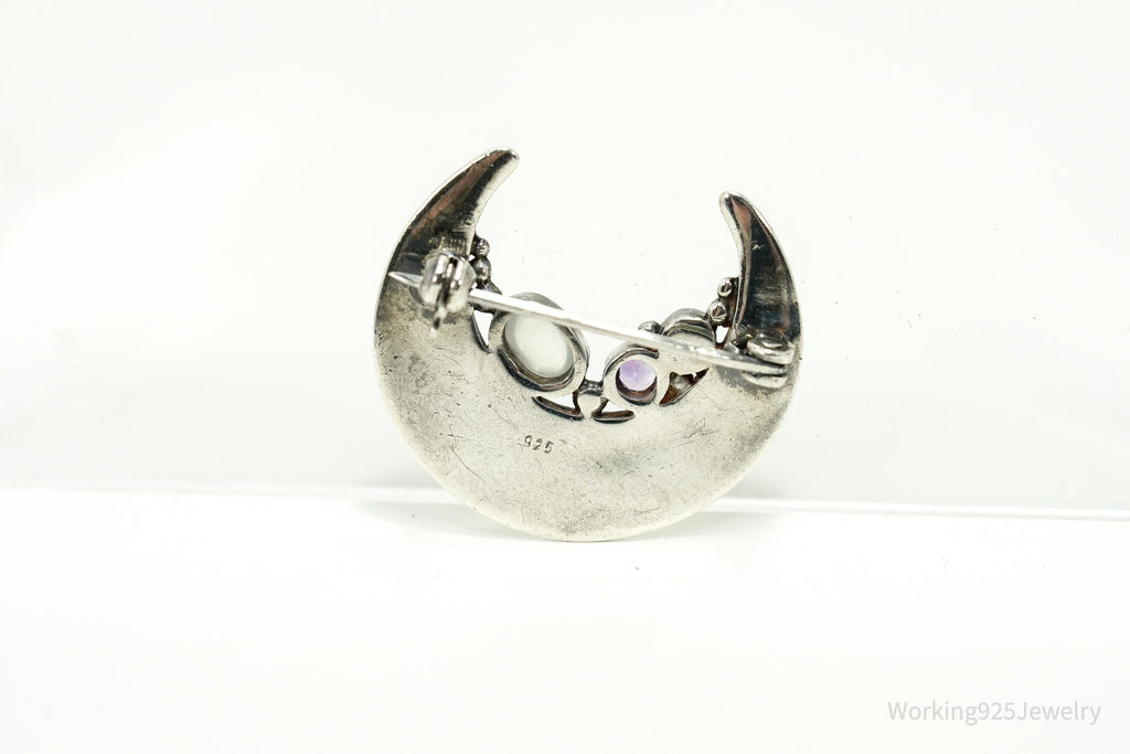 Vintage Amethyst & Moonstone Moon Sterling Silver Brooch Pin