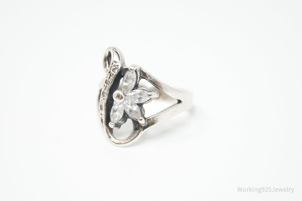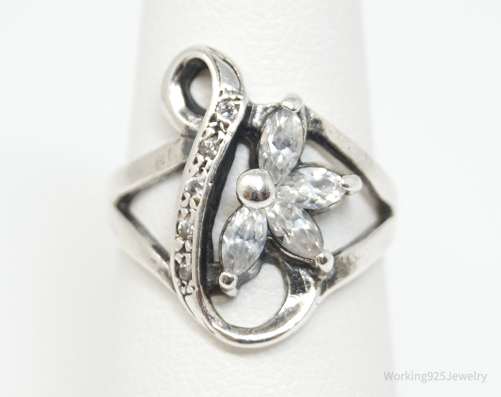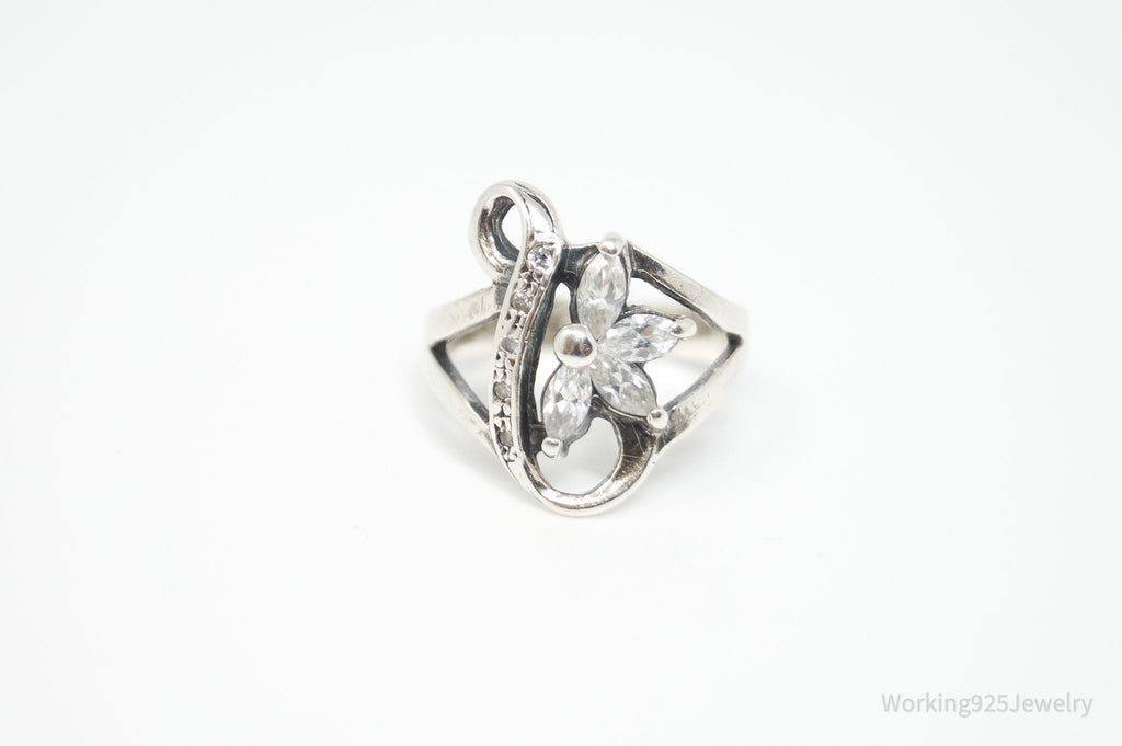 Vintage Art Deco Cubic Zirconia Floral Sterling Silver Ring - Sz 5.75