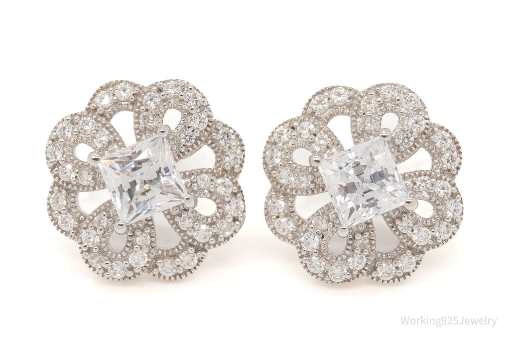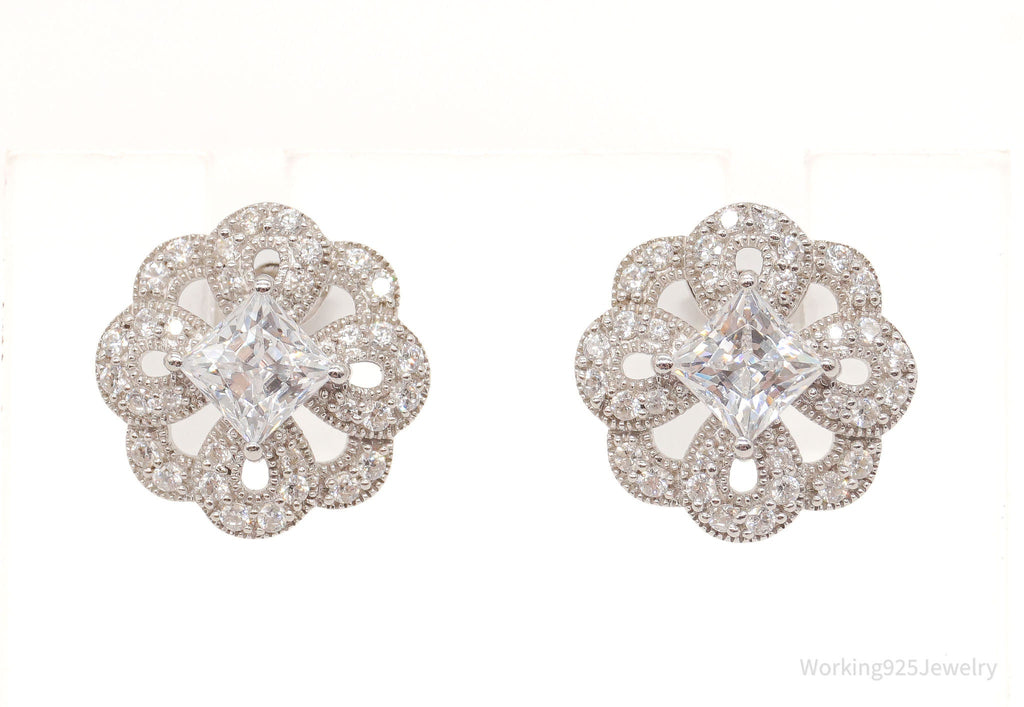 Vintage Art Deco Cubic Zirconia Flowers Sterling Silver Stud Post Earrings