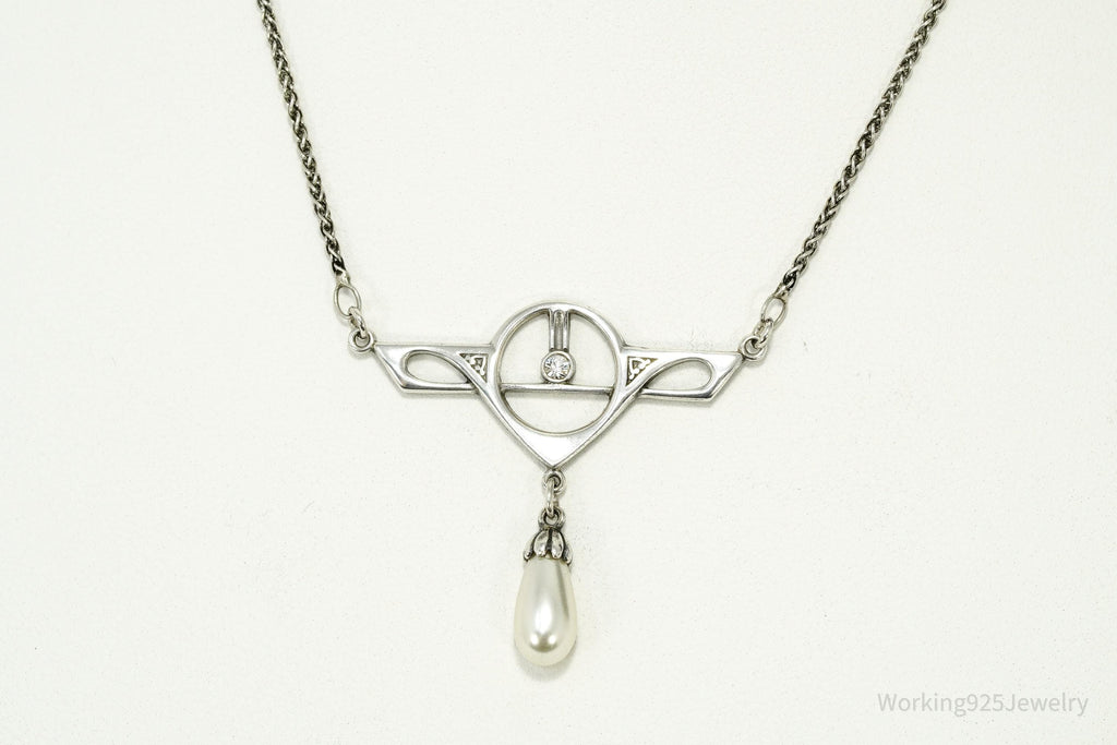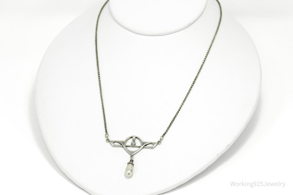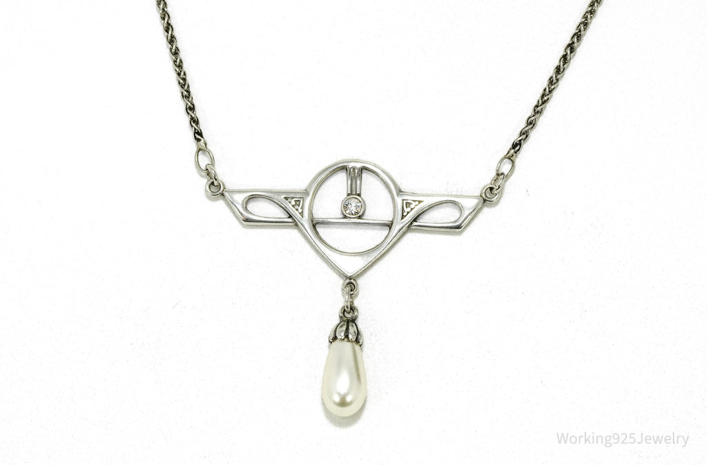 Vintage Art Nouveau Style Pearl & Swarovski Crystal Sterling Silver Necklace 15"