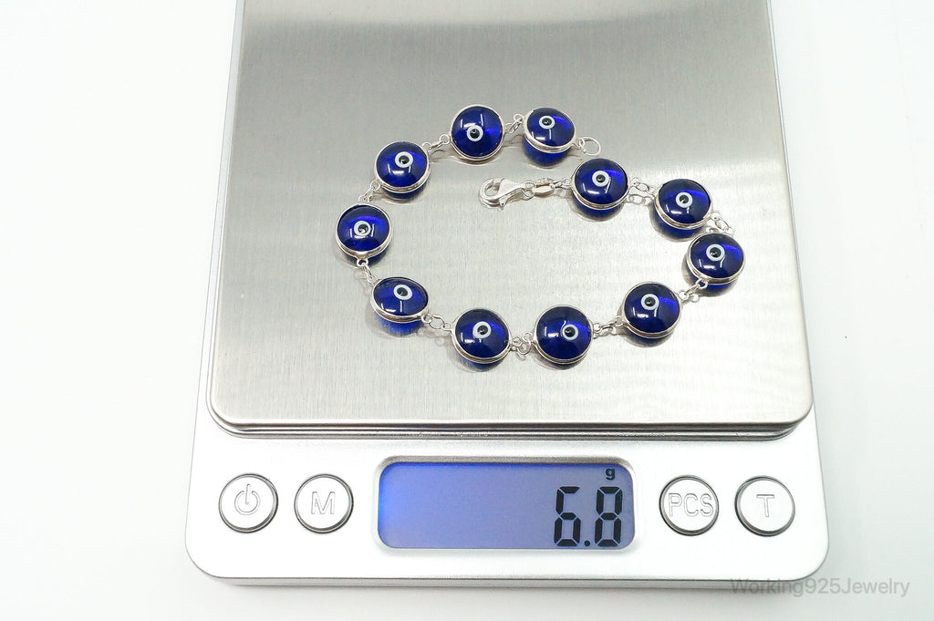 Vintage Blue Glass Eye Sterling Silver Link Bracelet