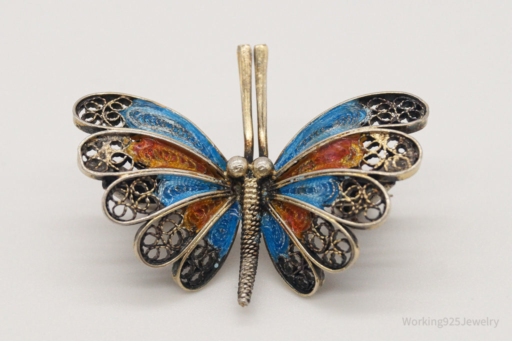 Vintage Butterfly Enamel Gold Wash 800 Silver Filigree Pin Brooch