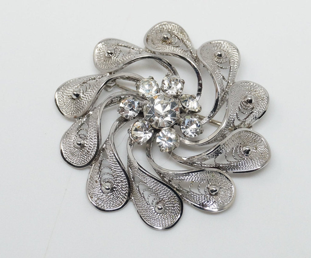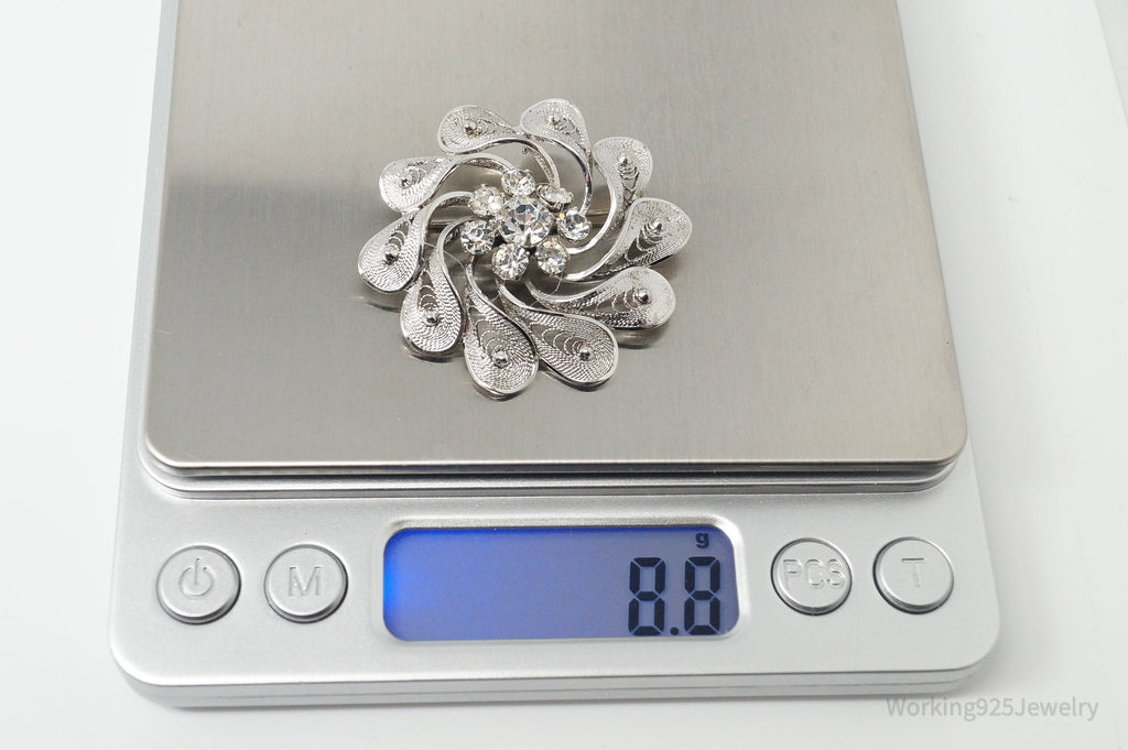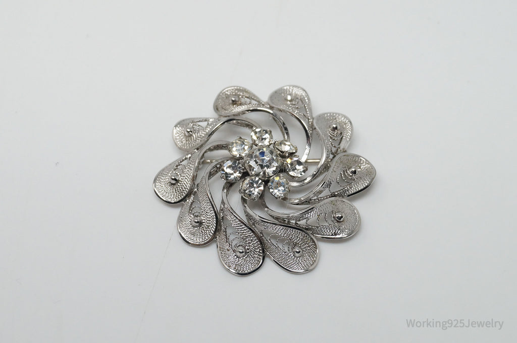 Vintage Designer Ann Lee Rhinestone Floral Filigree Sterling Silver Brooch
