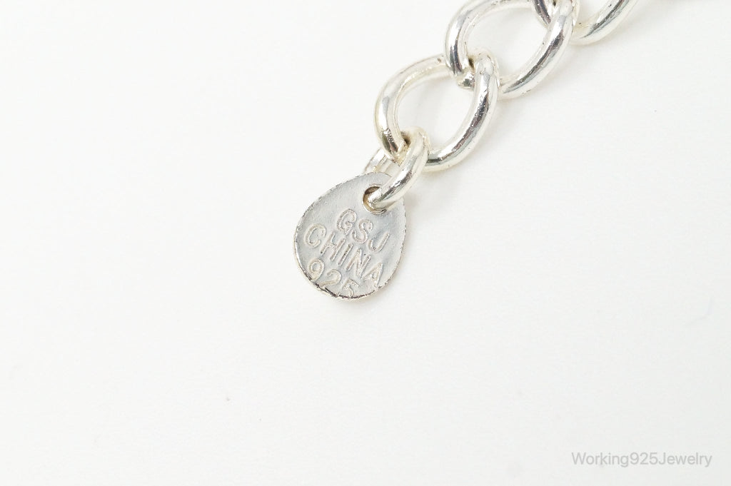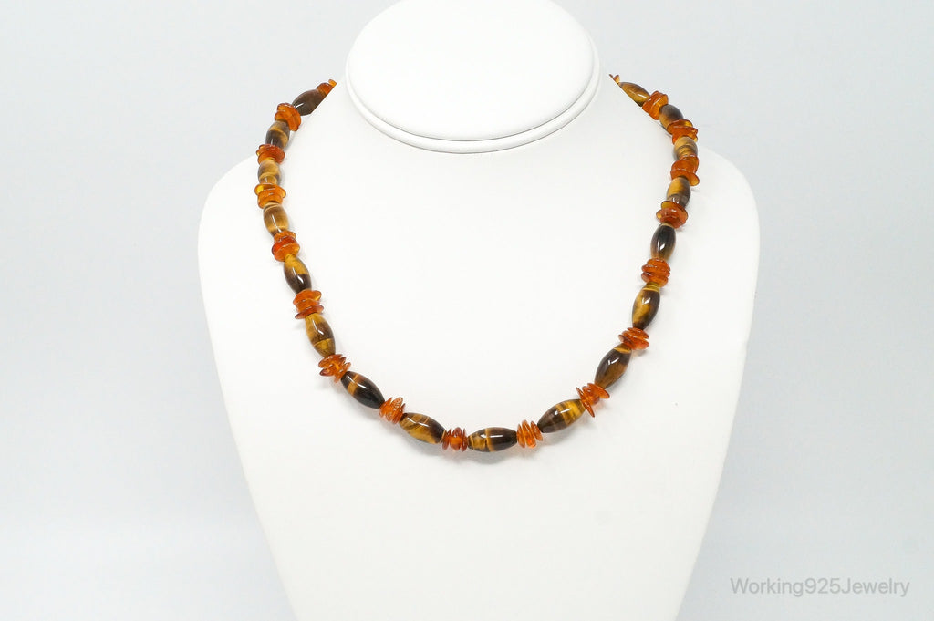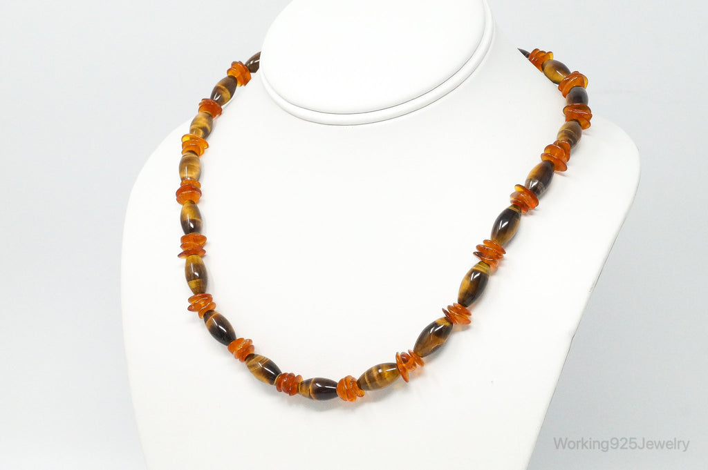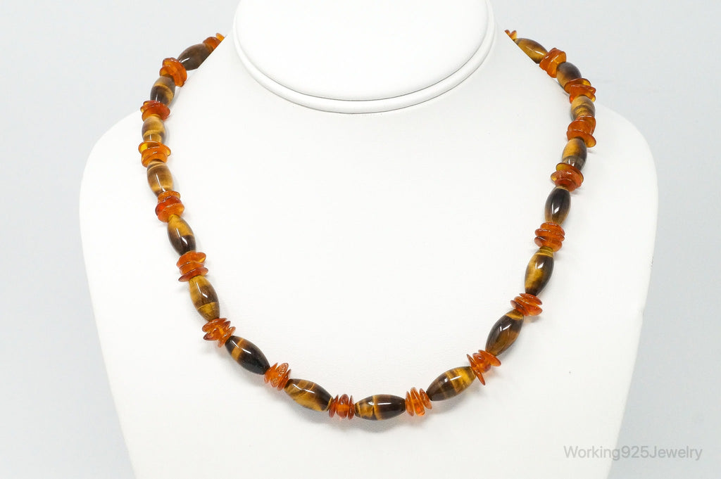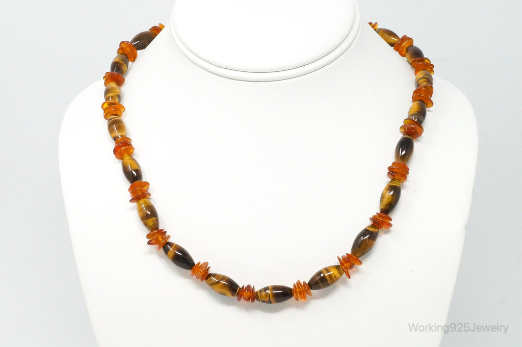 Vintage Designer GSJ Amber Tigers Eye Beads Sterling Silver Necklace