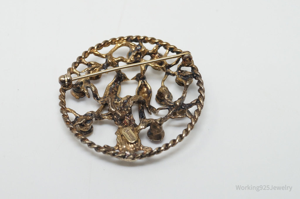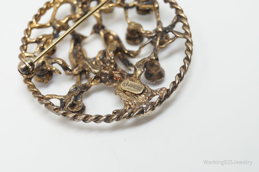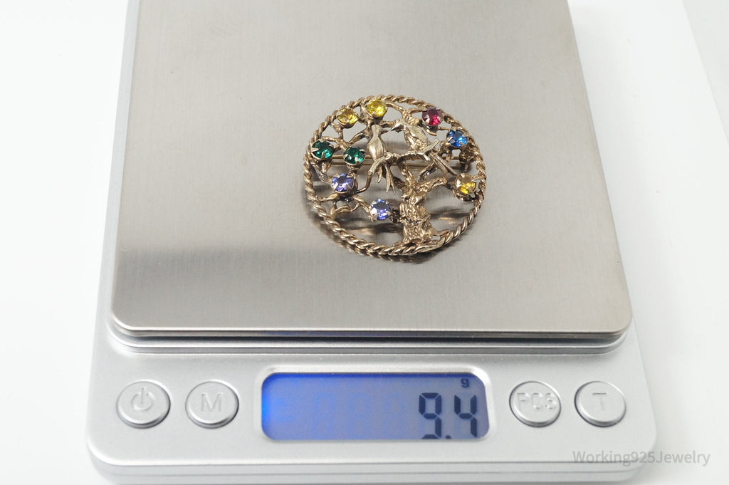 Vintage Designer Love Birds Rhinestone Sterling Silver Brooch Pin
