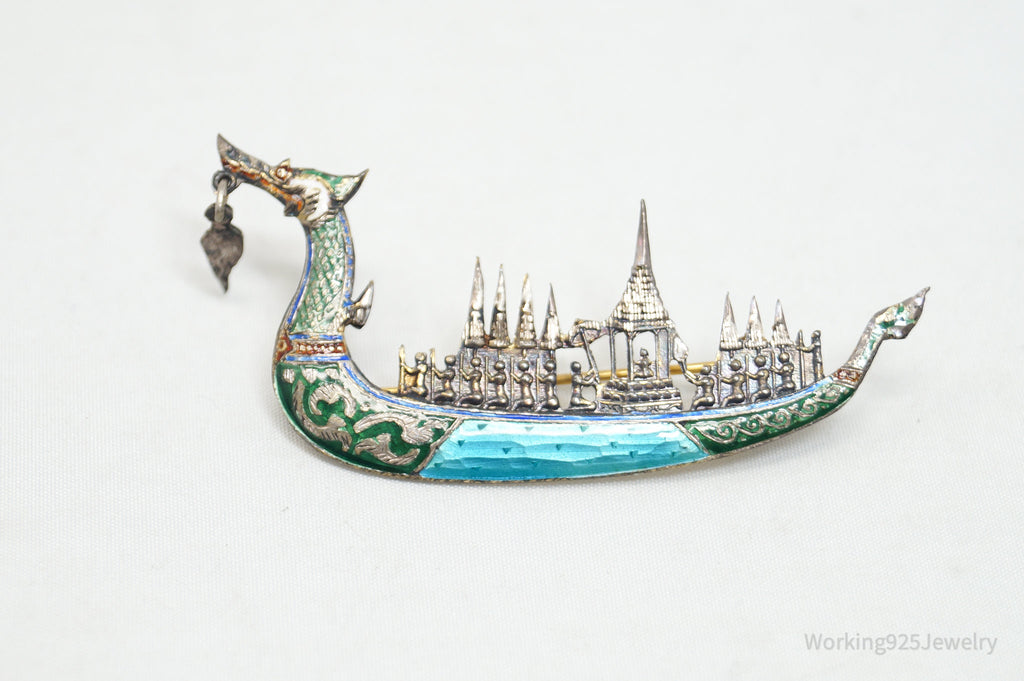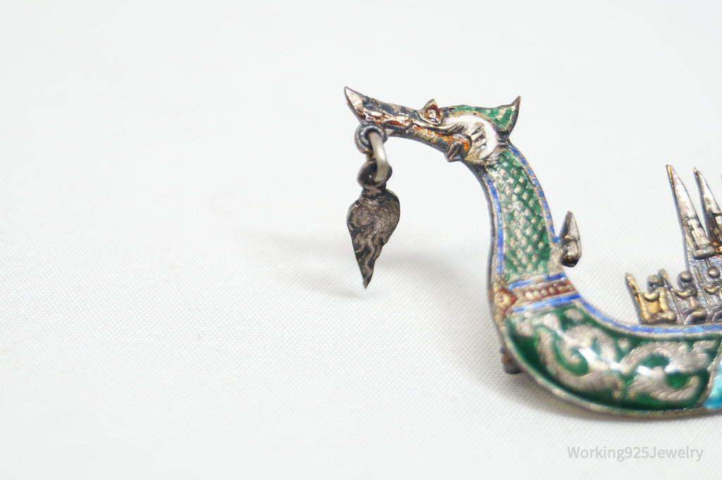 Vintage Designer SIAM Suphanahongse Viking Ship Enamel Sterling Silver Brooch
