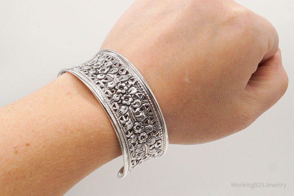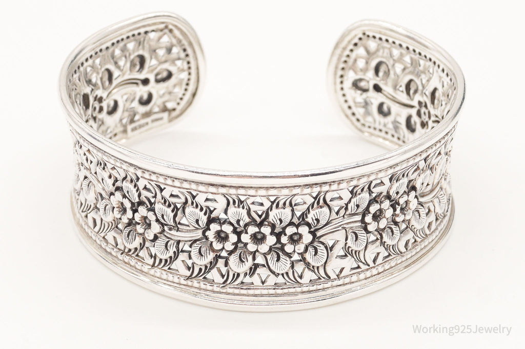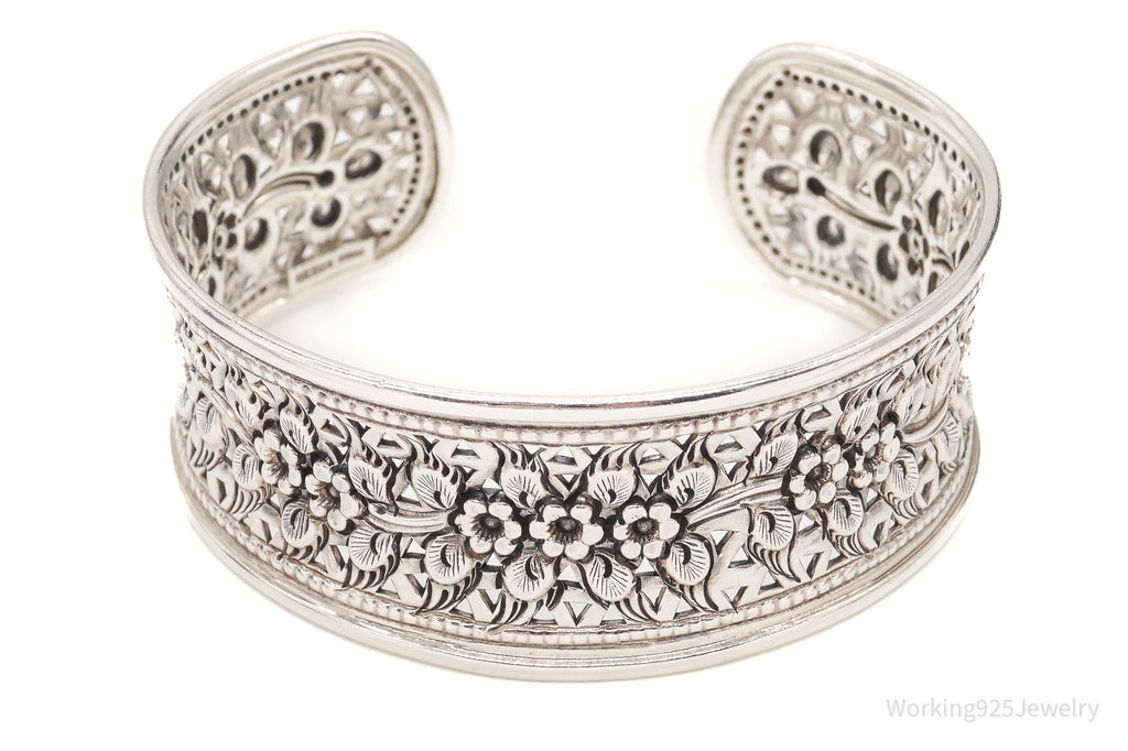 Vintage Designer SX Floral Pattern Flowers Sterling Silver Cuff Bracelet