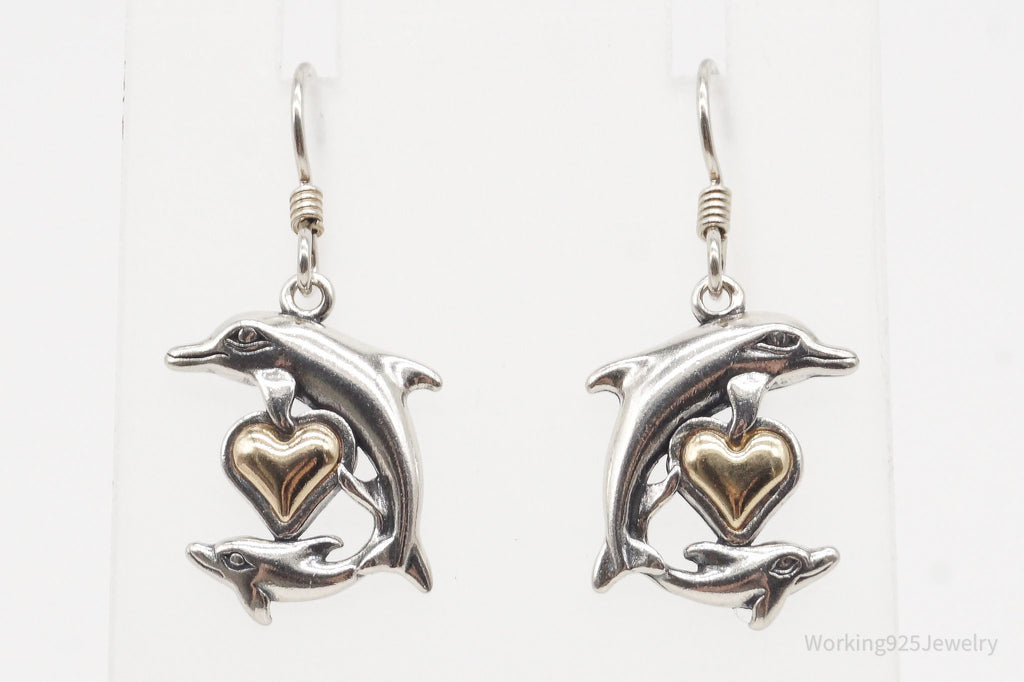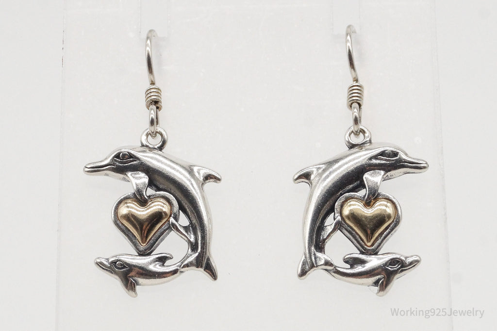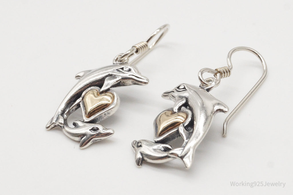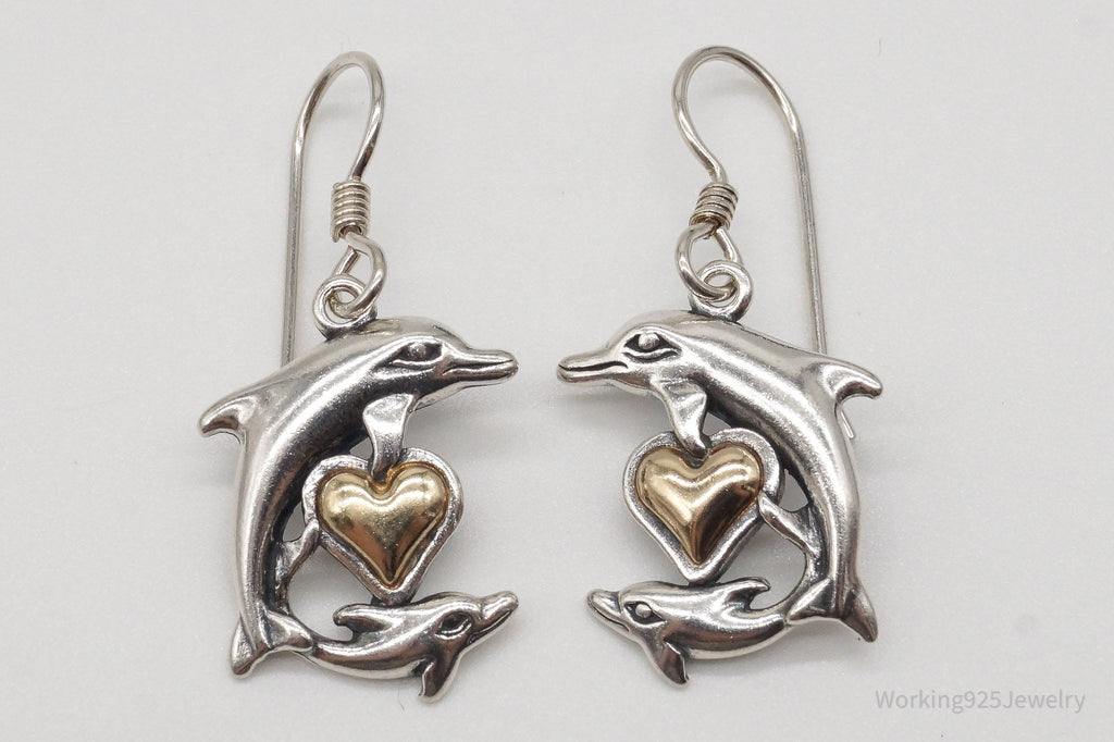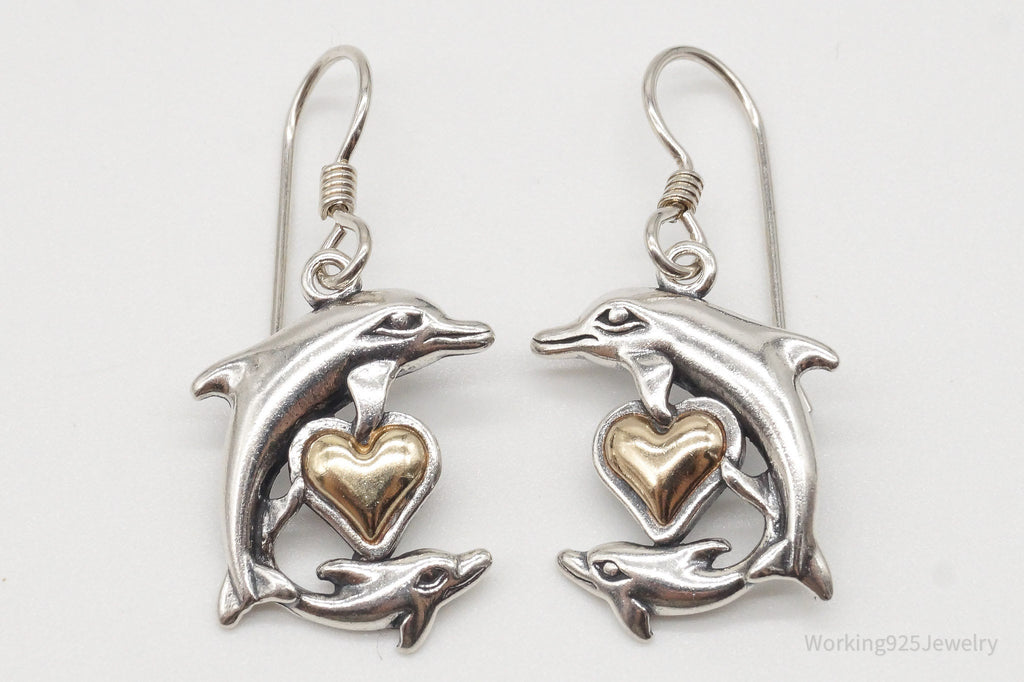 Vintage Designer Waldeck Johnson 14K Gold Heart Dolphin Sterling Silver Earrings