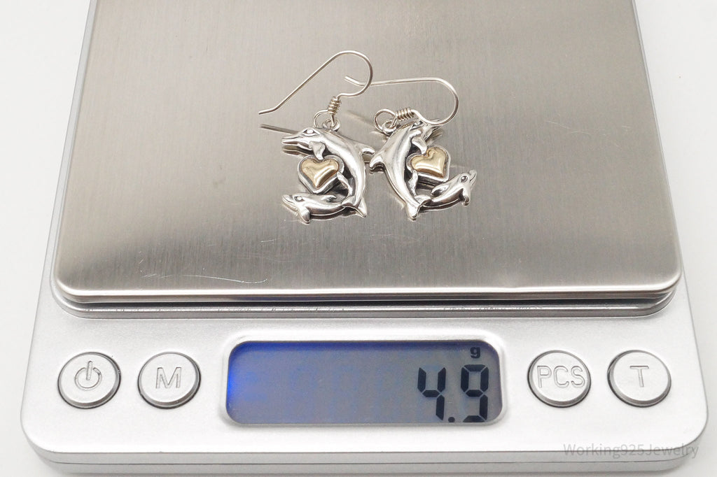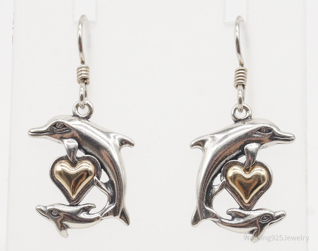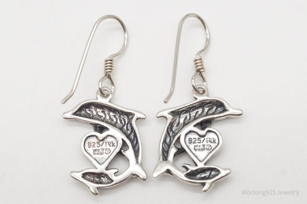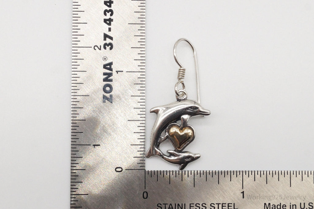 Vintage Designer Waldeck Johnson 14K Gold Heart Dolphin Sterling Silver Earrings