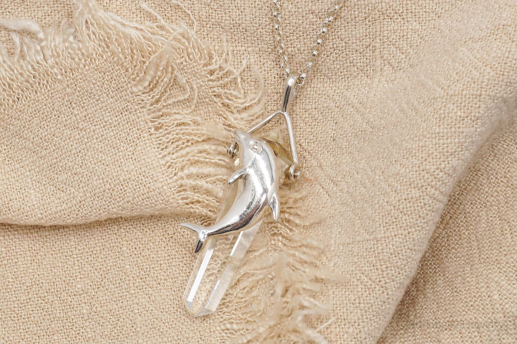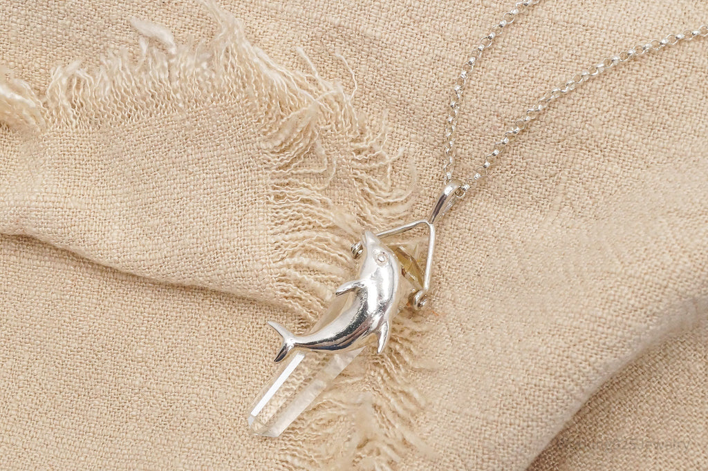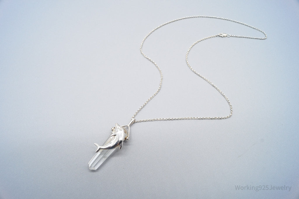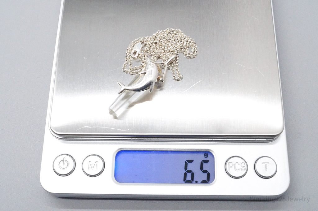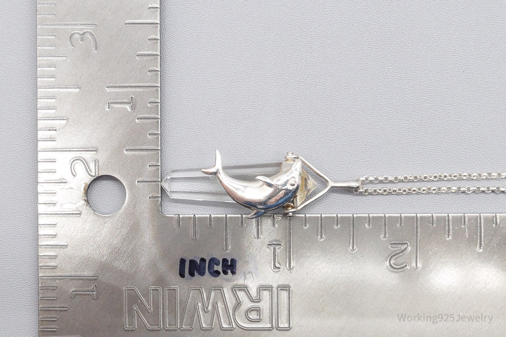 Vintage Dolphin & Crystal Sterling Silver Necklace 18"