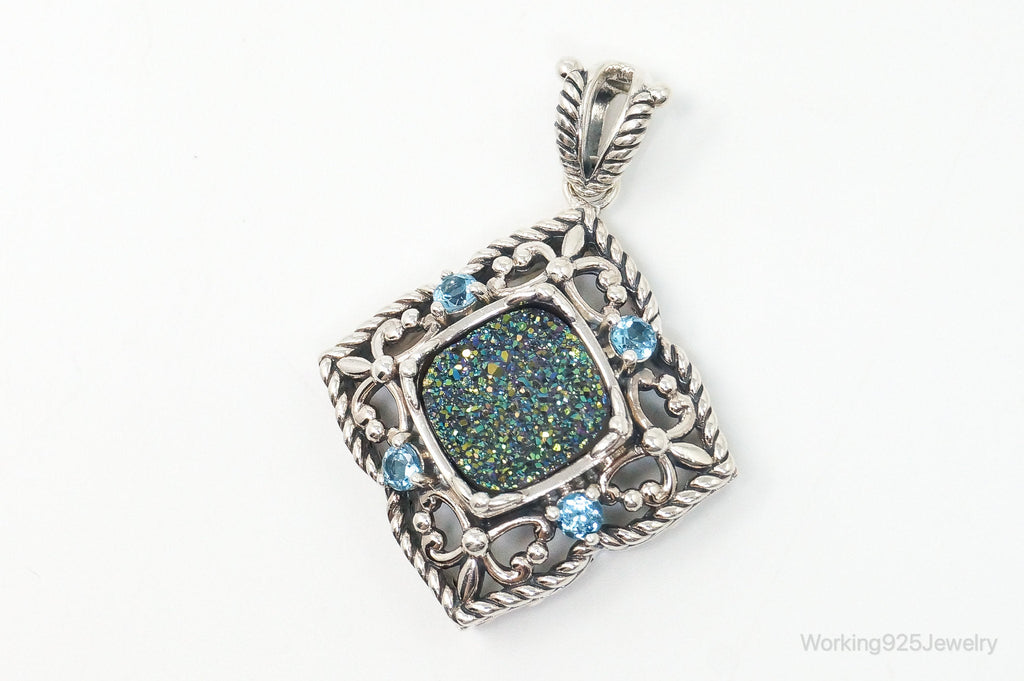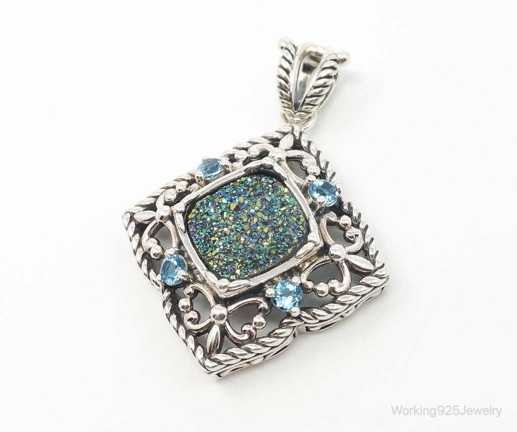 Vintage Druzy Quartz Blue Topaz Sterling Silver Necklace Pendant