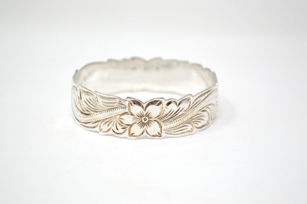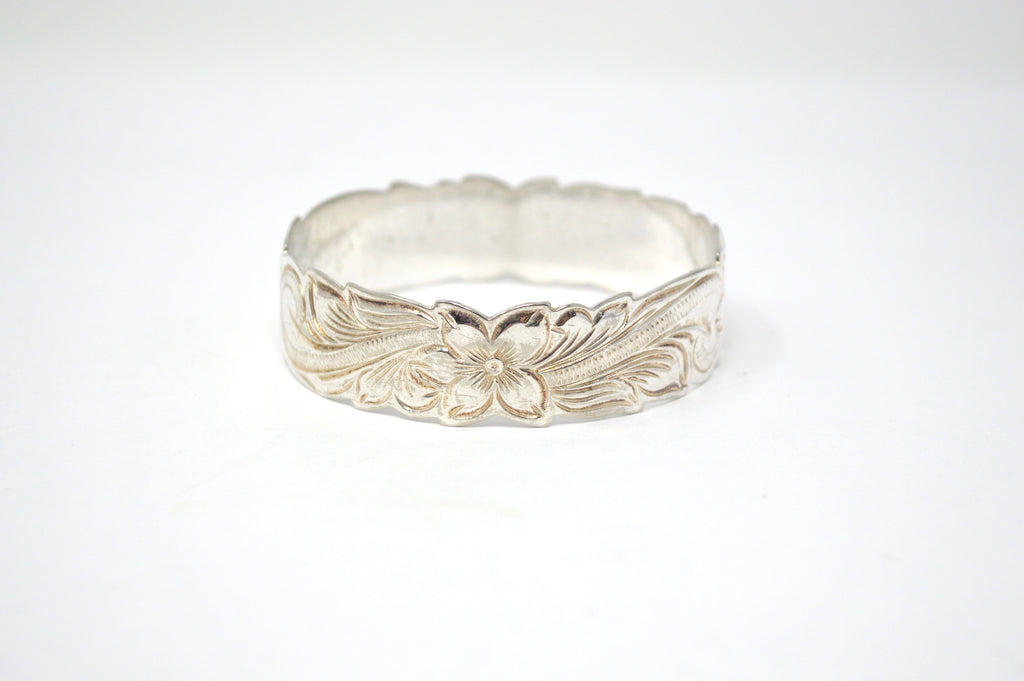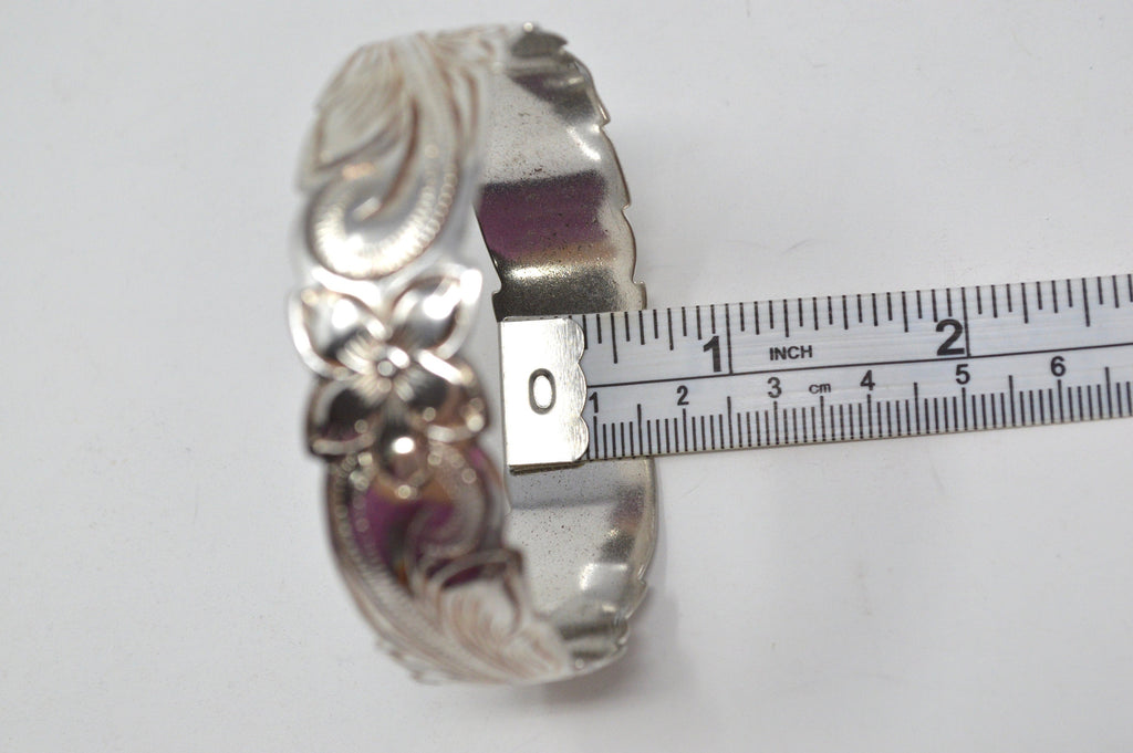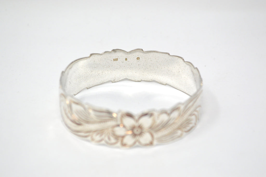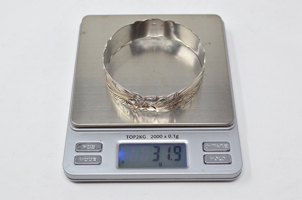 Vintage Floral Flower Pattern Carved Sterling Silver Bangle Bracelet