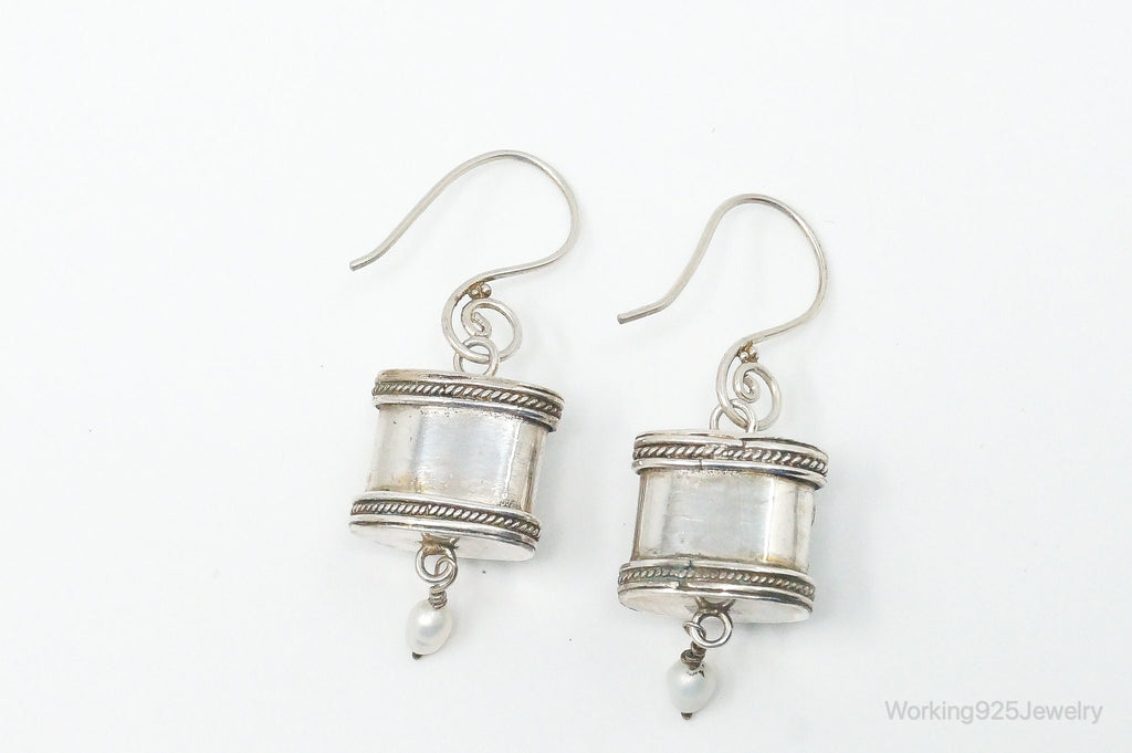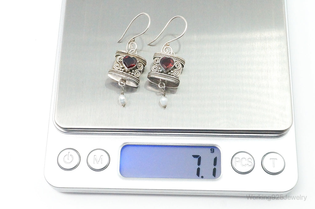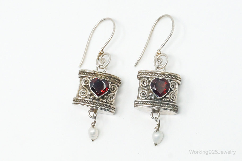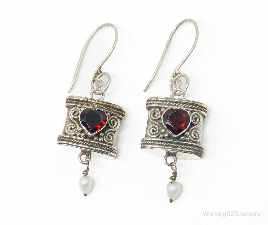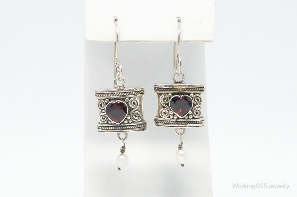 Vintage Garnet Heart Pearl Bali Inspired Sterling Silver Earrings