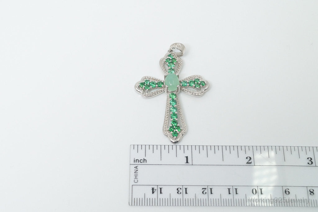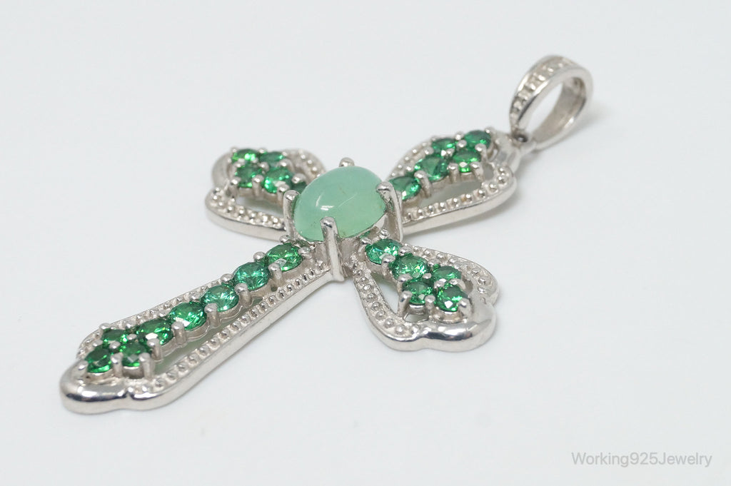 Vintage Green Chalcedony Green Cubic Zirconia Cross Sterling Silver Pendant