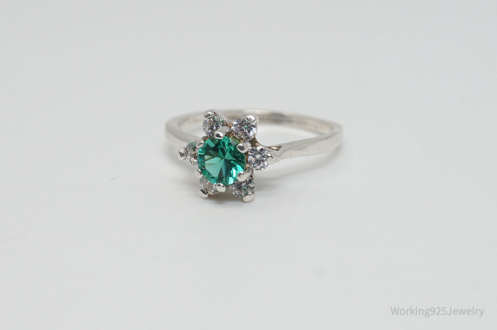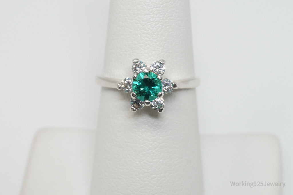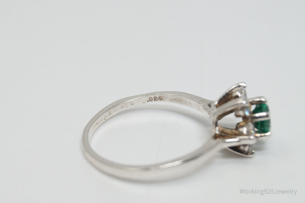 Vintage Lab Green Emerald CZ Flower Sterling Silver Ring - Sz 6.75