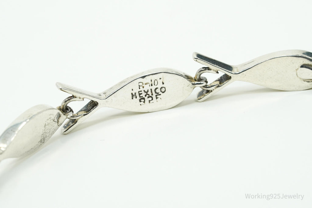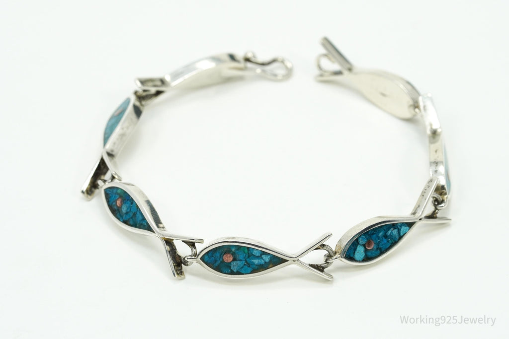 Vintage Mexico Blue Turquoise Inlay Fish Pattern Sterling Silver Bracelet - 7.25"
