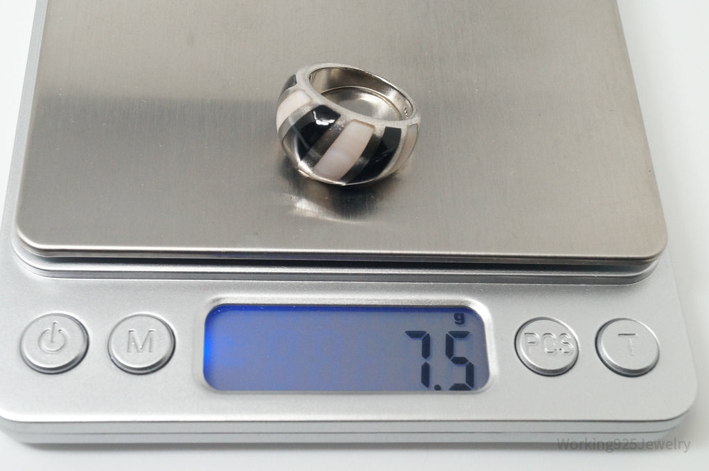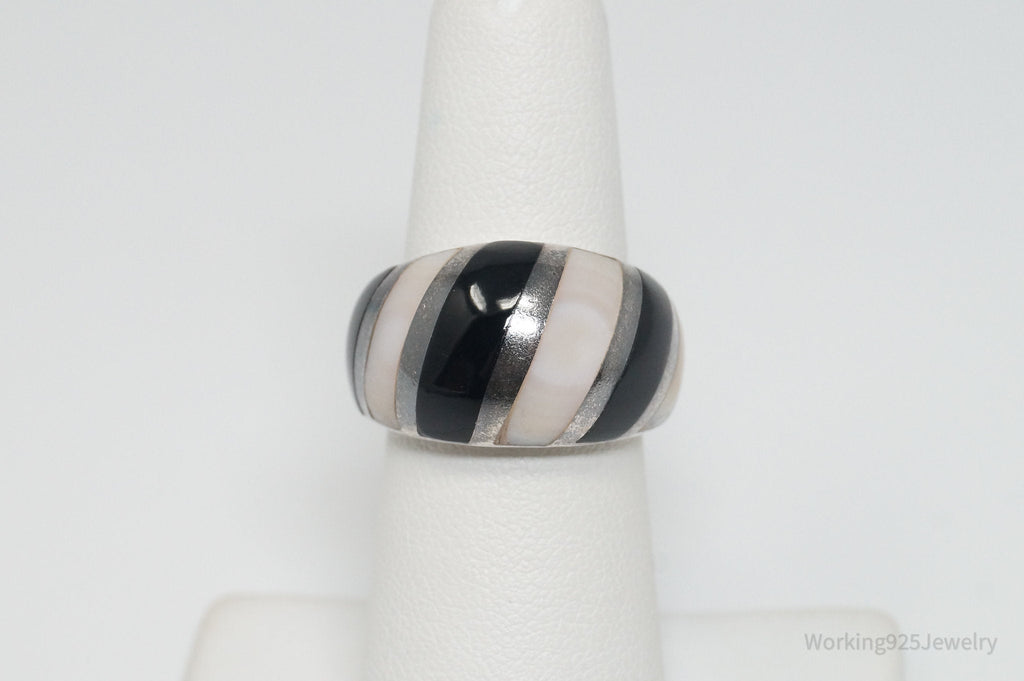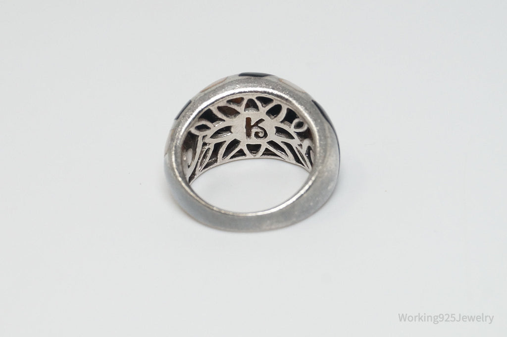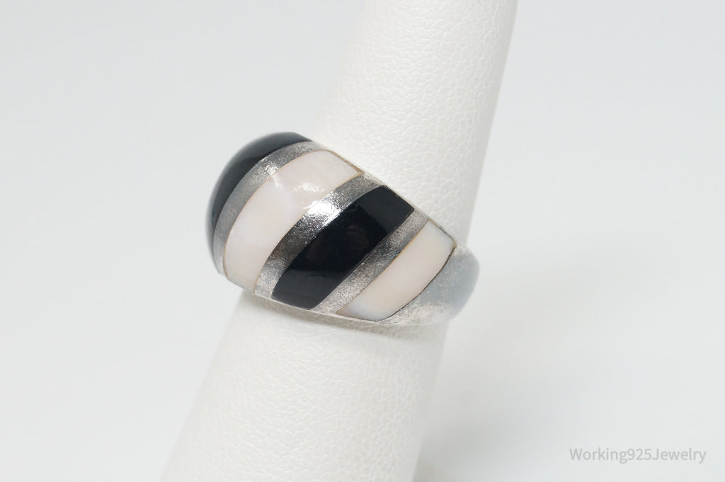 Vintage Mother Of Pearl Black Onyx Art Deco Style Sterling Silver Ring - SZ 5.75