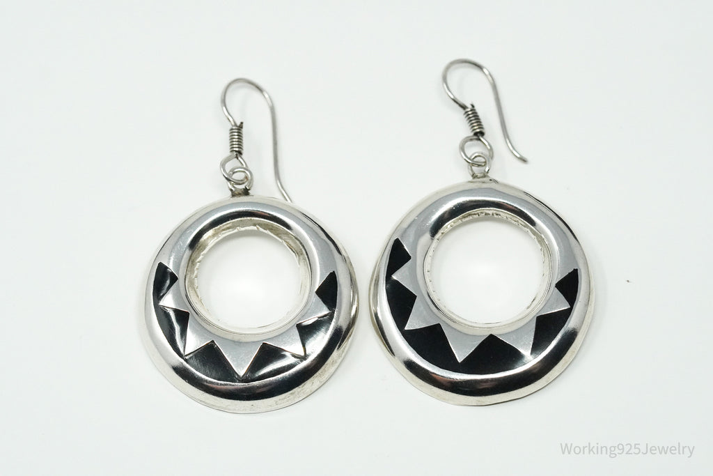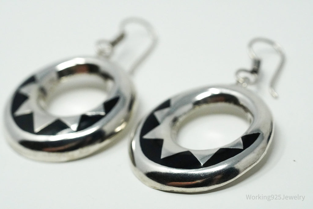 Vintage Taxco Mexico Onyx Inlay Sterling Silver Earrings 2"